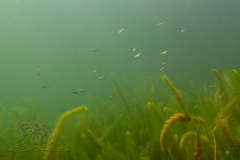Zentimetergroße Barsche und Rotaugen zogen in gemischten Schwärmen entlang der Tausendblattbestände. Als Taucher für harmlos befunden, wurden wir integriert und begleitet, wohl in der Hoffnung, dass wir großen dunklen Ungetüme die Fressfeinde auf Abstand halten. Doch die großen Barsche und Hechte schienen gesättigt: Sie ruhten oder zogen mit Abstand ihre Bahnen.