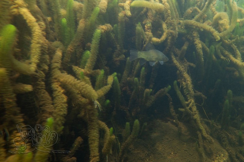 Bevor die Hitze des Hochsommertages auch die Fluten des Haselbergs erreichte, waren dessen Fische noch recht aktiv. Vor allem die Karpfen sorgten bei ihrer Futtersuche noch für dichte Sedimentwolken. Dazwischen huschten einige Schleie umher, allein die Hechte ruhten gelassen im Tausendblatt und schienen noch volle Mägen zu haben. Tausende Kleinfische hatten dichte Schwärme gebildet und genossen oberflächennah mit uns die Morgensonne.