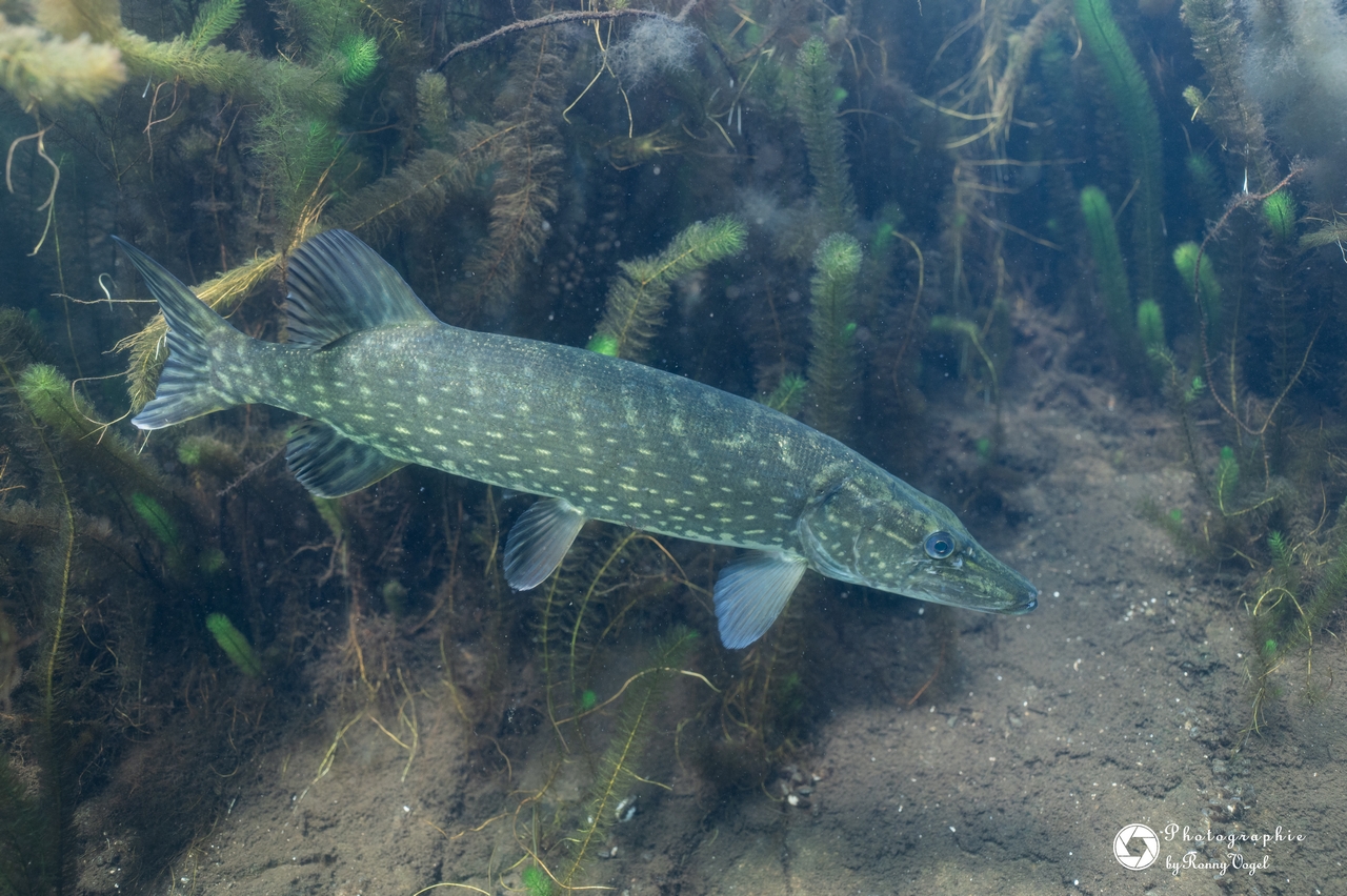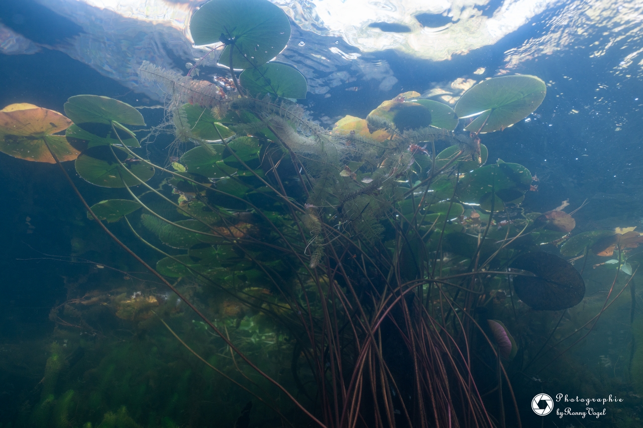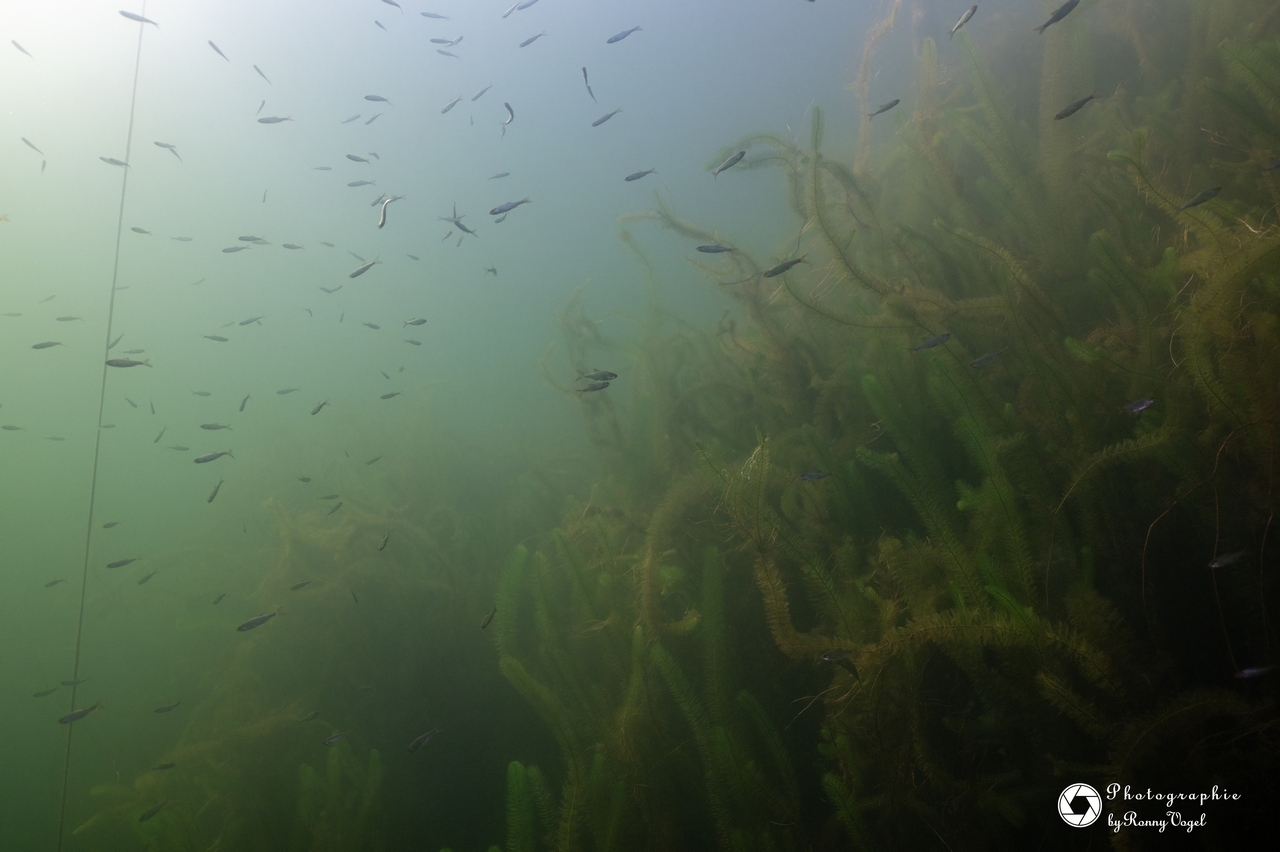 Er kündete, im Wasser schwebend und rotierend, in verschiedenen Farben vom ausgehenden Sommer und bunten Herbst in unserer Region. Auch außerhalb des Steinbruchs boten die Früchte und Blätter der Gehölze farbenfrohe Impressionen. Untere Wasser konnten wir erneut vielfältige Fische in großer Menge beobachten. Karpfen und Schleie wühlten, Hechte und Flussbarsche jagten. Aber nicht alle Rotaugen hatten für ihre Mäuler die passende Größe und blieben unbehelligt. Auch ein Wels kreuzte wieder mehrfach unsere Route.