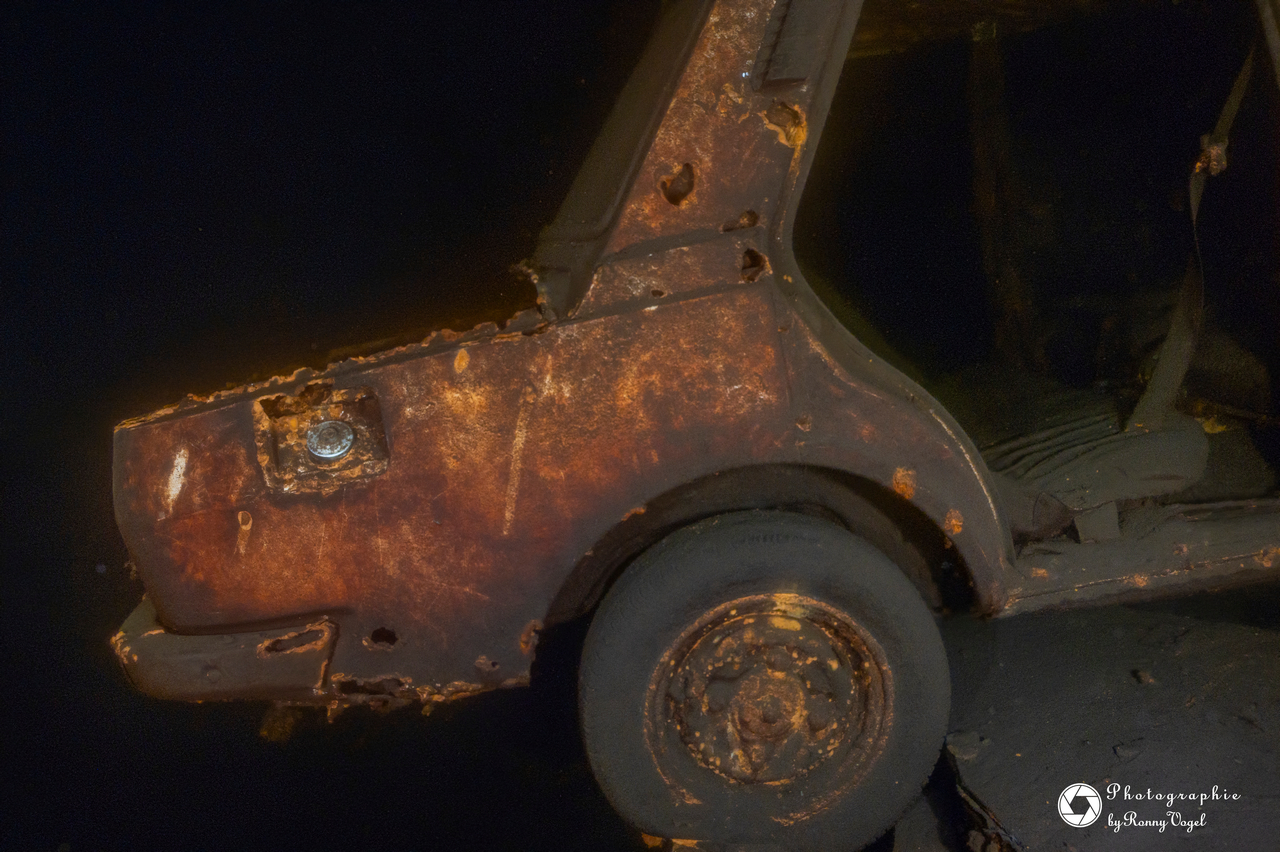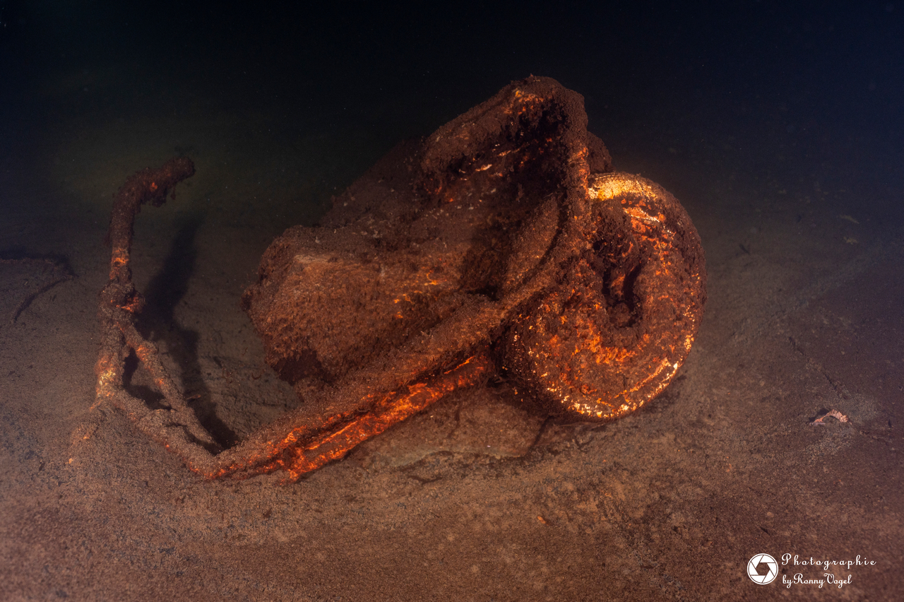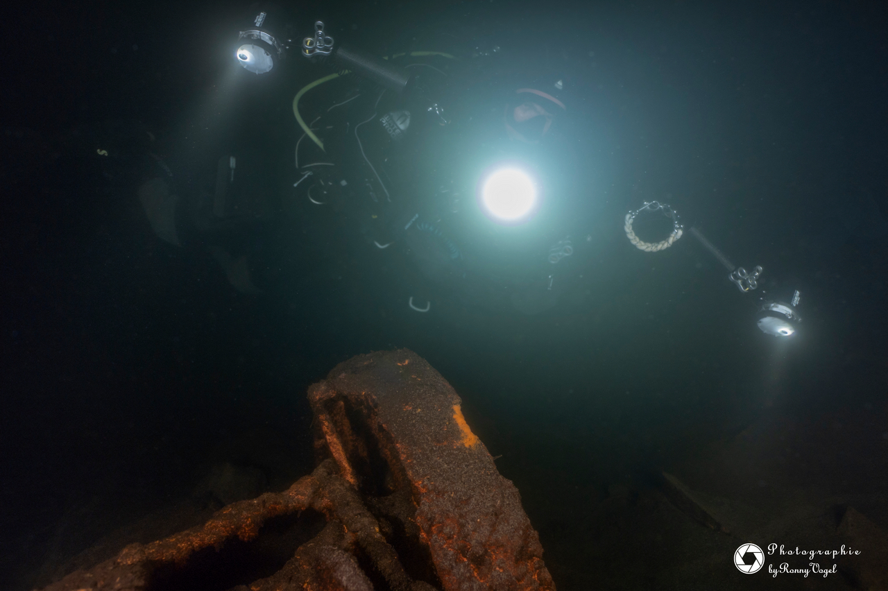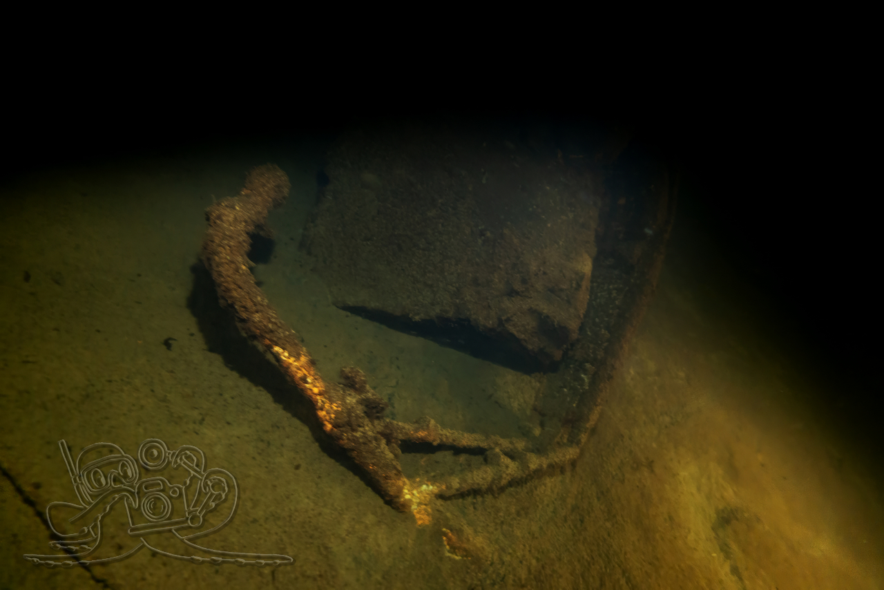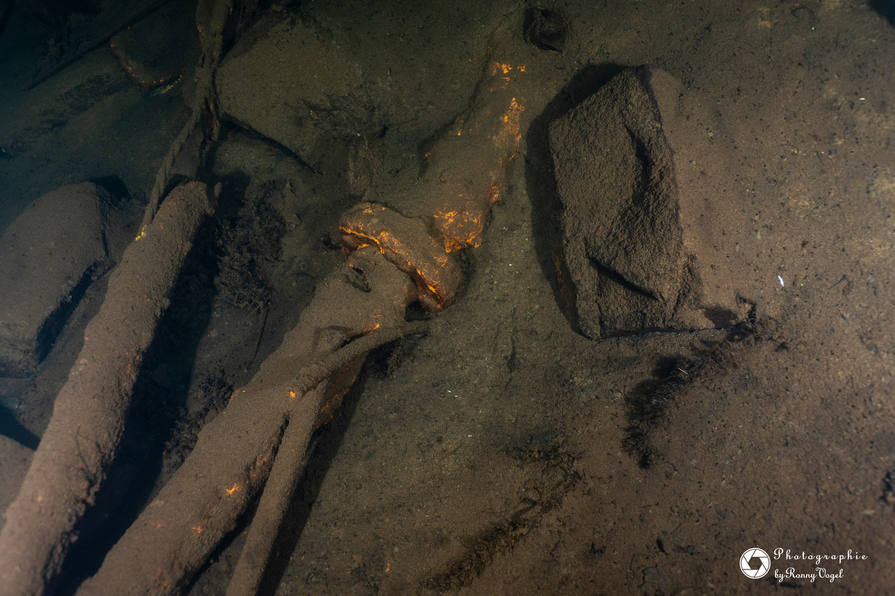 Bei -1 °C Luft- und +4 °C Wassertemperatur hatten wir den Bruch wieder einmal ganz für uns alleine. Zunächst waren wir enttäuscht, denn schlechte Sicht empfing uns auf den ersten zehn Metern des Abstiegs. Im Kessel änderte sich die Sicht zum Positiven. So setzten wir unsere Runde über die beiden Wartburg-Wracks auf dem Kesselboden fort. Auf 25 Meter erwartete uns ein klar abgegrenzter Nebelvorhang, der uns glatt zu ein paar Schnappschüssen dieser Impression verleitete. Wir setzten unsere Runde über die Hinterlassenschaften des unteren Kessel-Plateaus fort. Zu unserer großen Freude fanden wir dort gar einen Aal, eine ruhende Schleie sowie zahlreiche kleine Barsche. Beim Austauchen entlang der Straße konnten wir im Nebel doch auch einige Rotaugen finden.