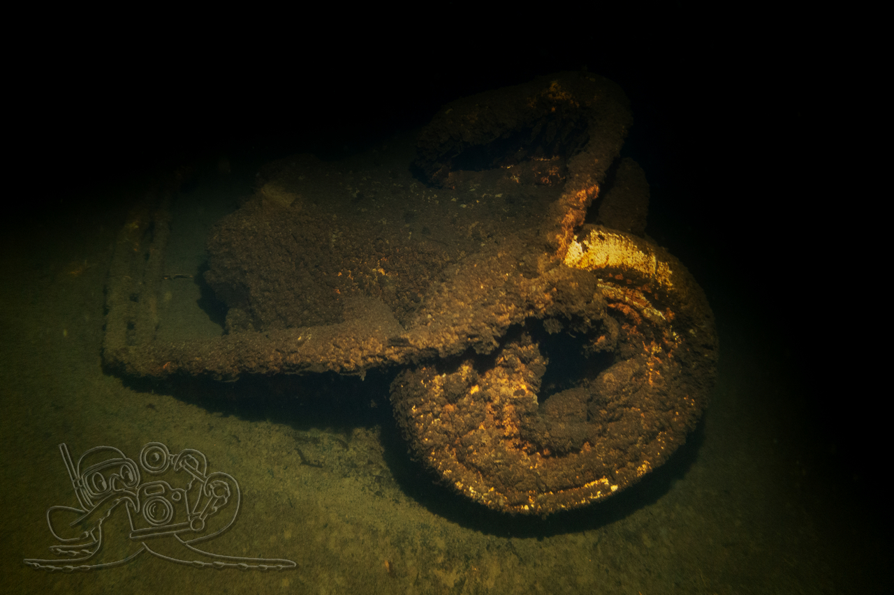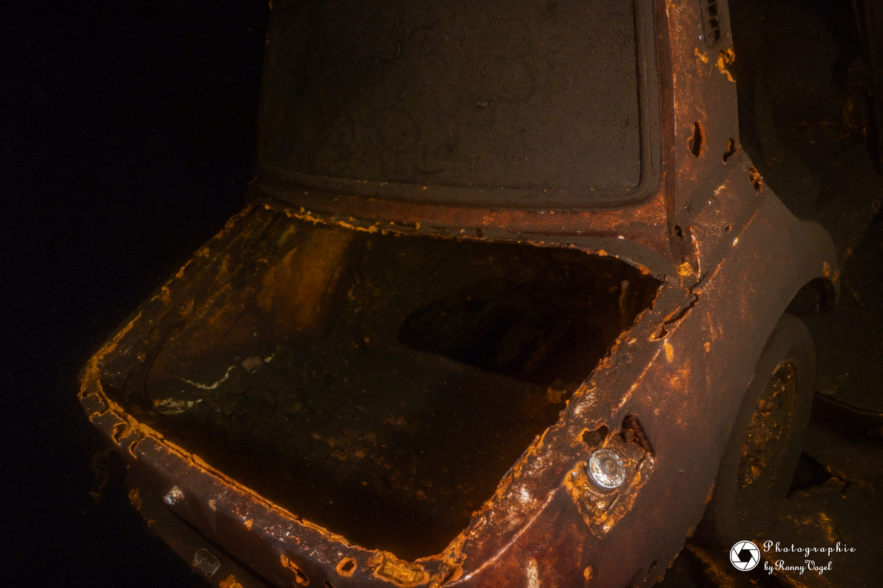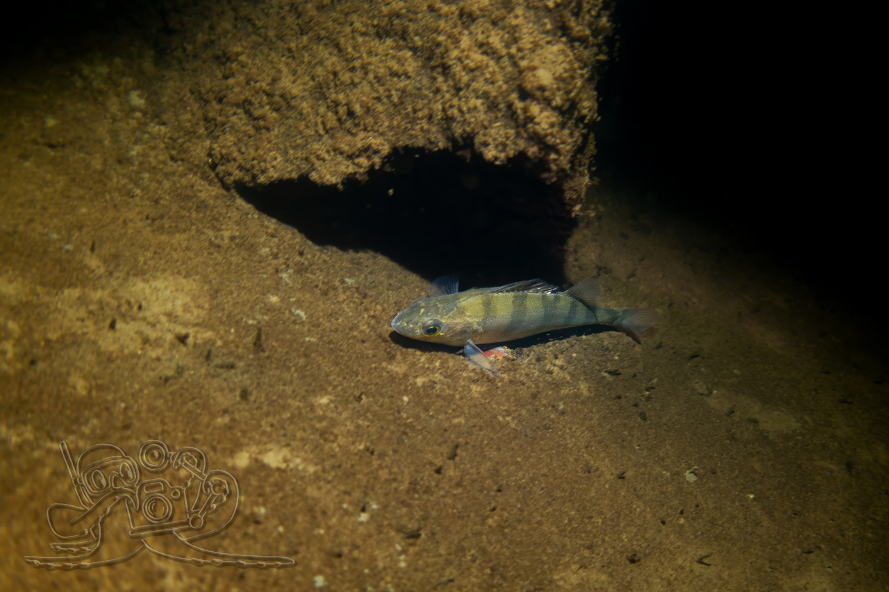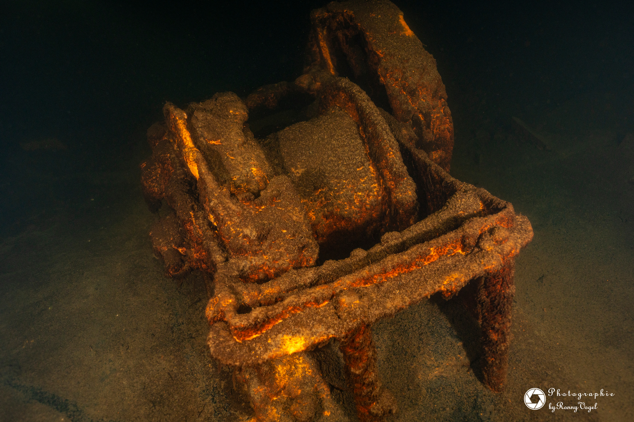 Bei -1 °C Luft- und +4 °C Wassertemperatur hatten wir den Bruch wieder einmal ganz für uns alleine. Zunächst waren wir enttäuscht, denn schlechte Sicht empfing uns auf den ersten zehn Metern des Abstiegs. Im Kessel änderte sich die Sicht zum Positiven. So setzten wir unsere Runde über die beiden Wartburg-Wracks auf dem Kesselboden fort. Auf 25 Meter erwartete uns ein klar abgegrenzter Nebelvorhang, der uns glatt zu ein paar Schnappschüssen dieser Impression verleitete. Wir setzten unsere Runde über die Hinterlassenschaften des unteren Kessel-Plateaus fort. Zu unserer großen Freude fanden wir dort gar einen Aal, eine ruhende Schleie sowie zahlreiche kleine Barsche. Beim Austauchen entlang der Straße konnten wir im Nebel doch auch einige Rotaugen finden.