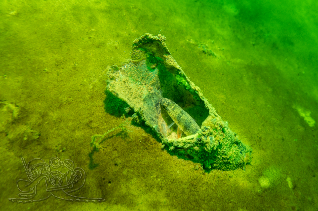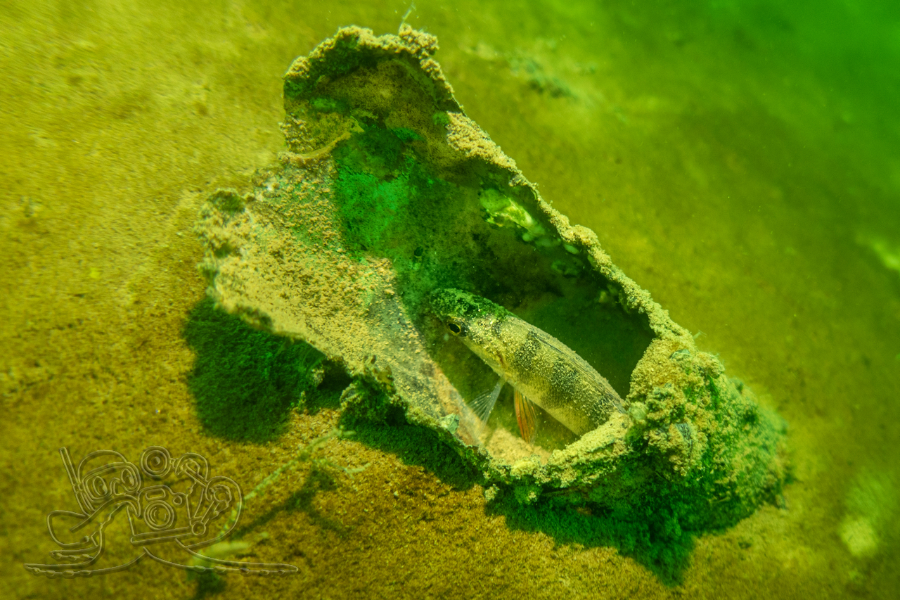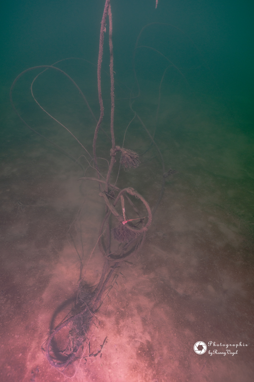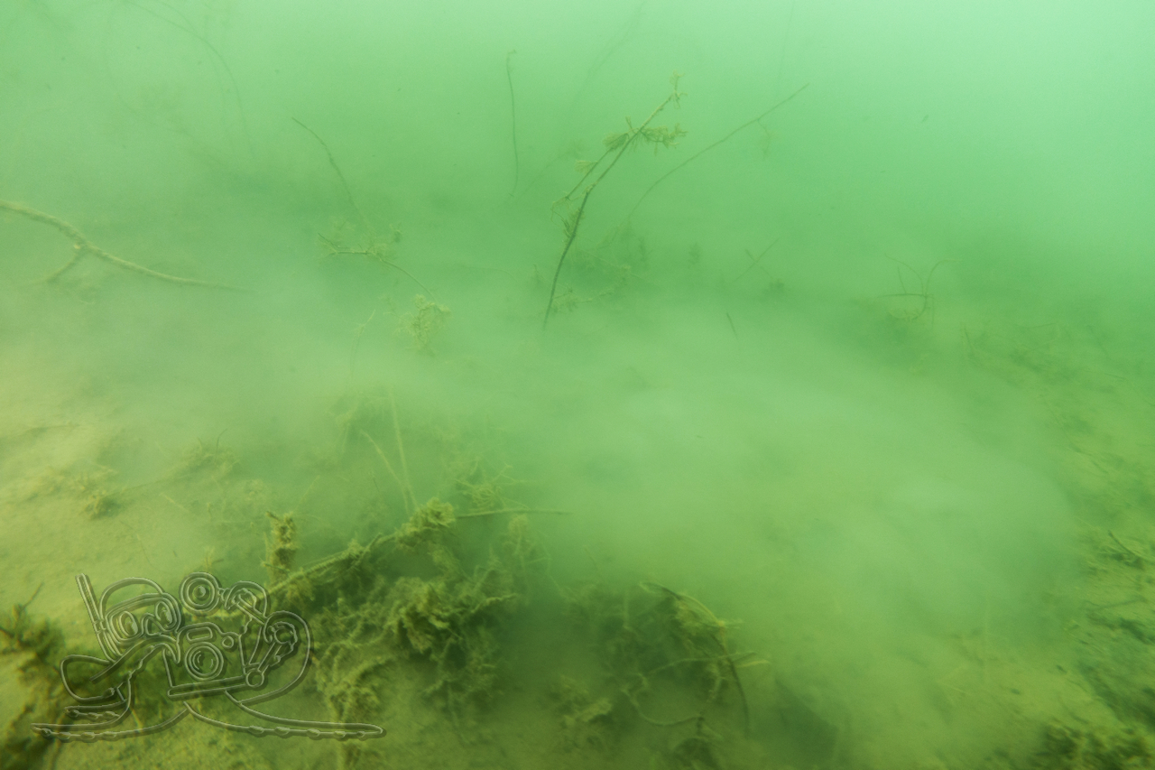 Bedingt durch die zurückliegenden Nachtfröste empfing unsere eine Wassertemperatur 3 °C. Entsprechend still zeigten sich Flora und Fauna. Von den Fischen fanden wir nur in der Tiefe zahlreiche Spuren im Sediment. Allein ein kleiner Flussbarsch hatte sich im Abfall eine schützende Behausung gesucht und hielt unseren Blicken stand. Die Sicht hatte sich in allen Tiefen verschlechtert, in oberen Bereichen fanden wir auch dicke Nebelbänke.