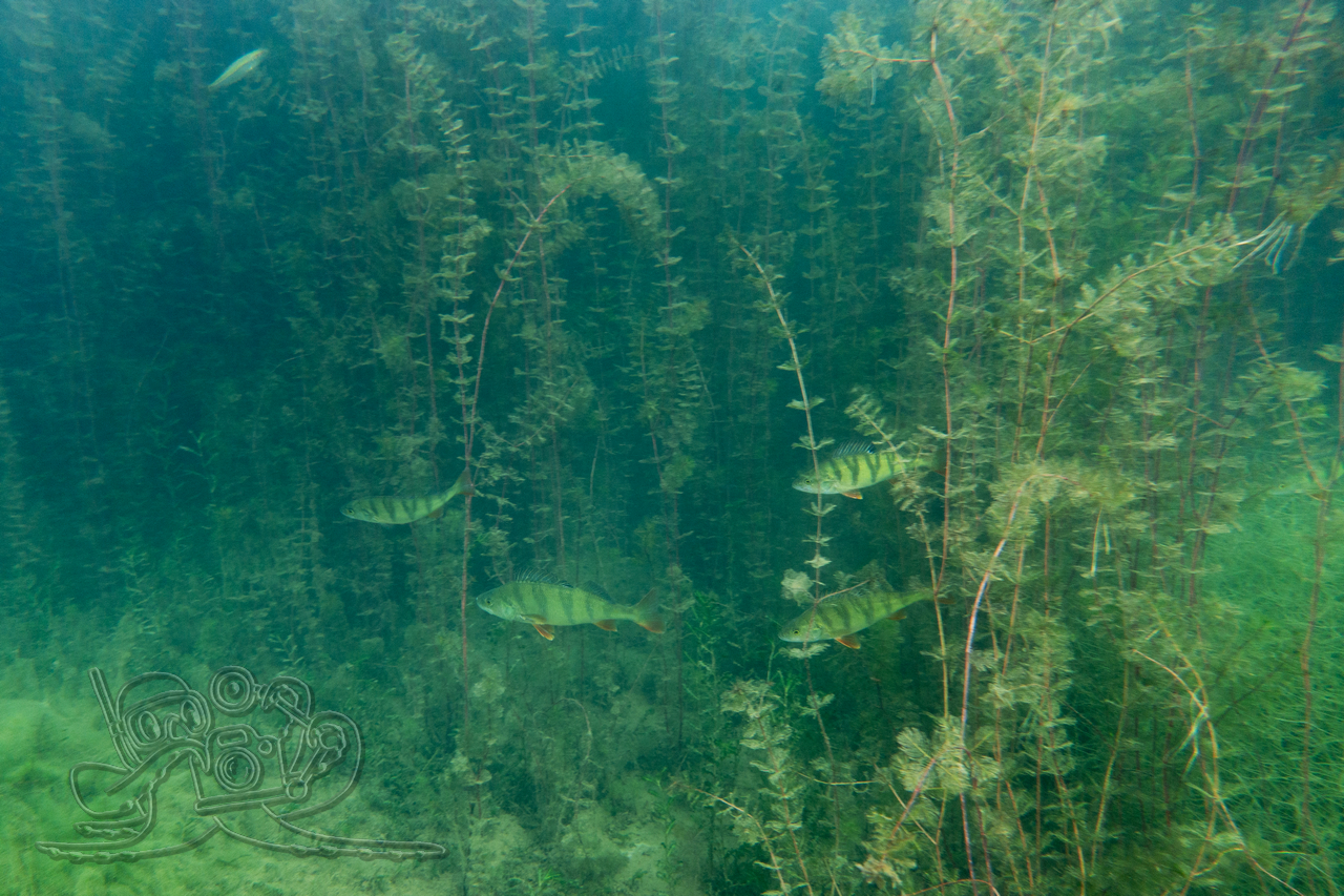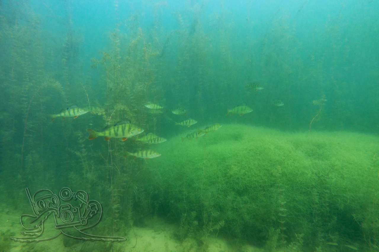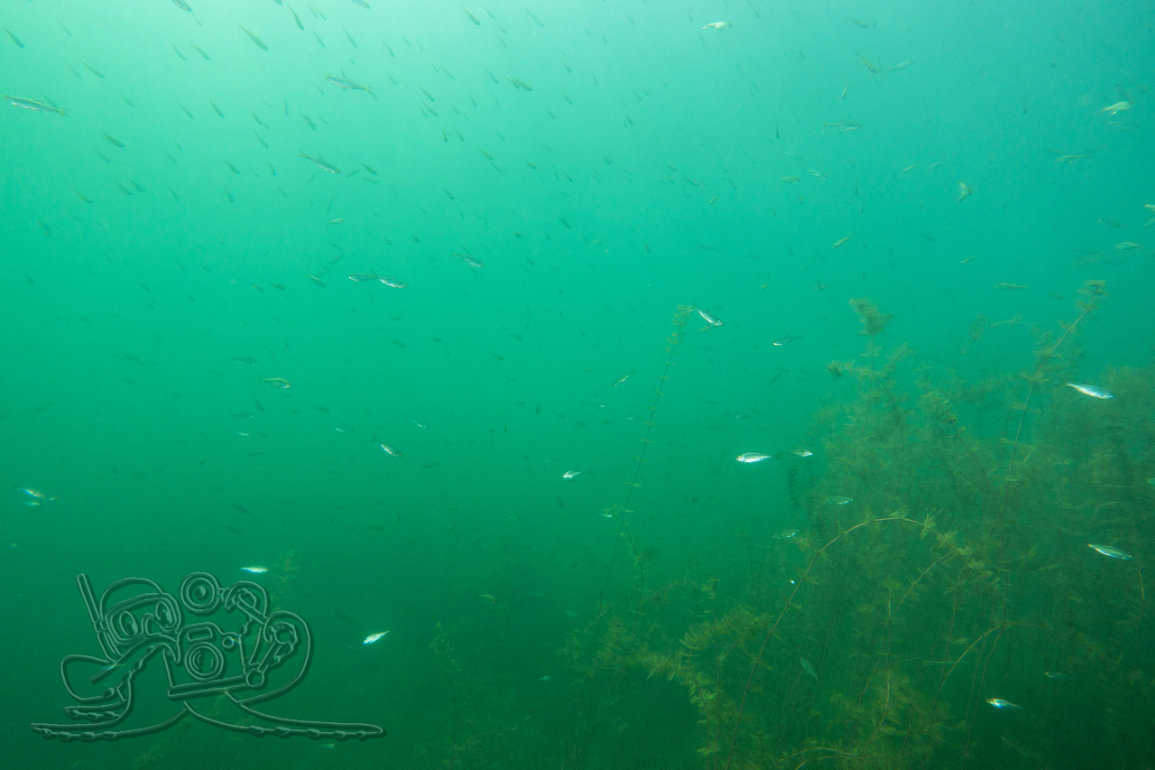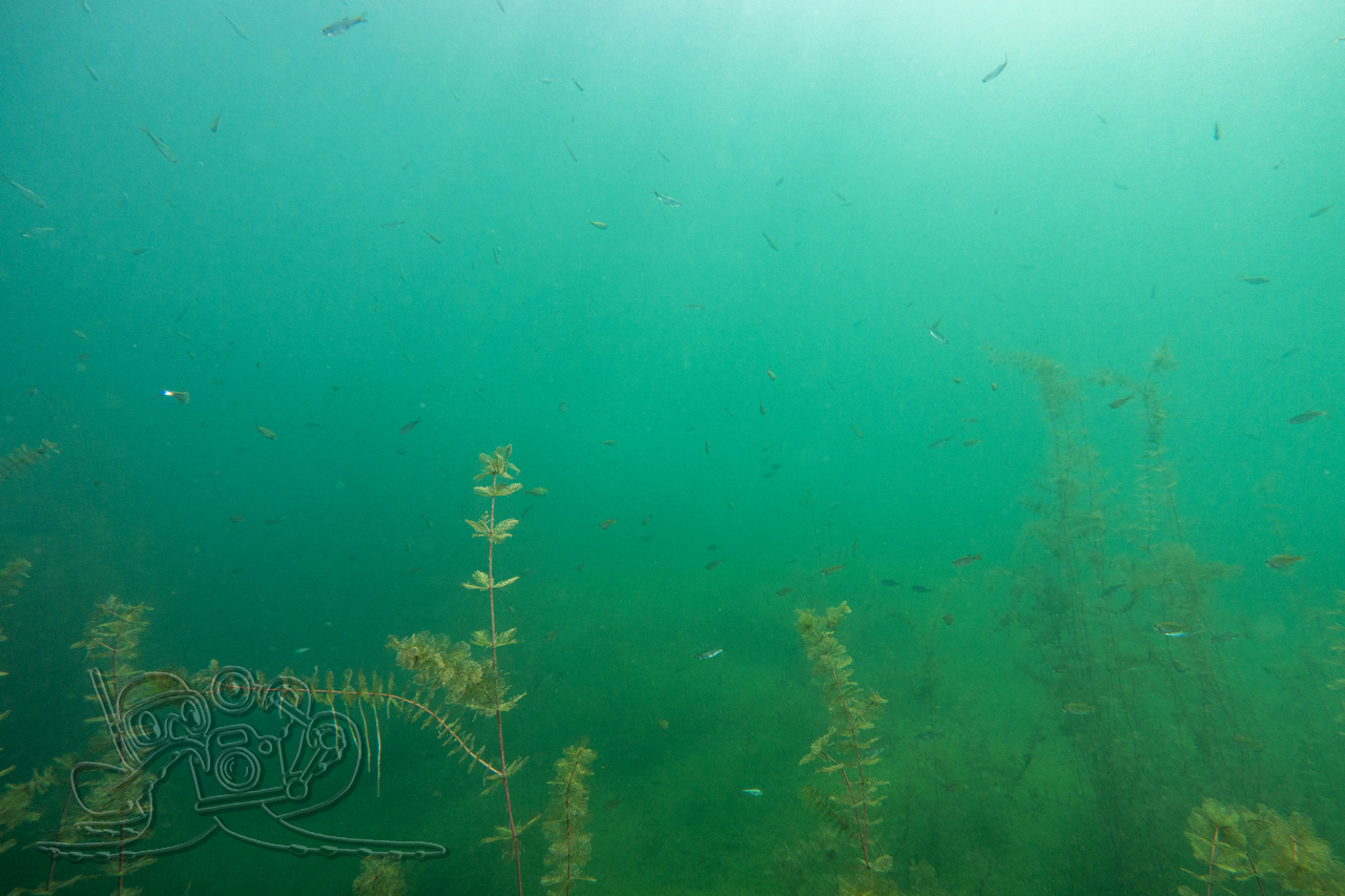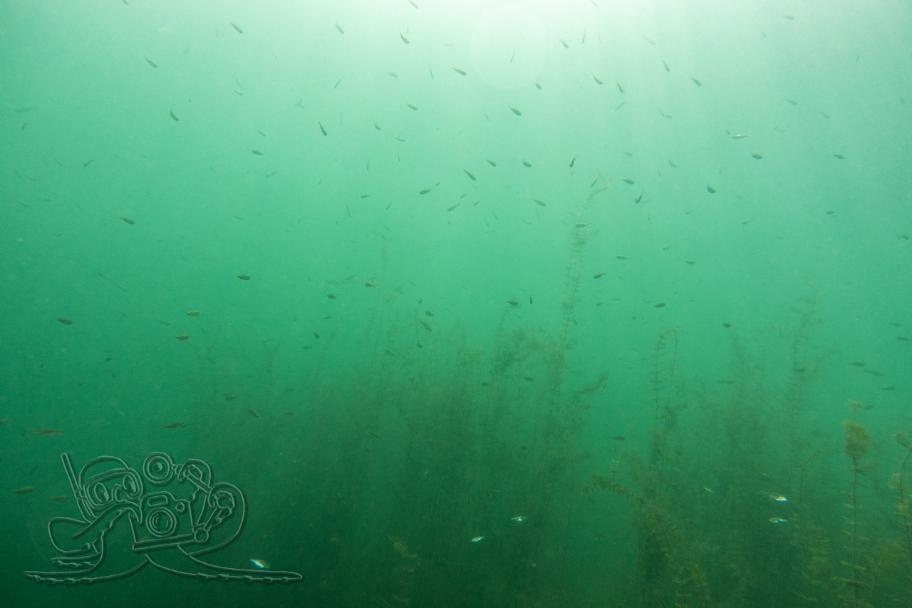 Beim ersten Tauchgang erkundeten wir die oberflächennahen Bereiche. Rund um flächige Sternarmleuchteralgen-Polster und am Tausendblattbestand fühlten wir uns wie in einem Süßwasseraquarium. Zahlreiche Kleinfischschwärme säumten unseren Weg. Gelegentlich schossen kleinere und größere Hechte aus dem Pflanzendickicht, um sich die Mägen zu füllen.