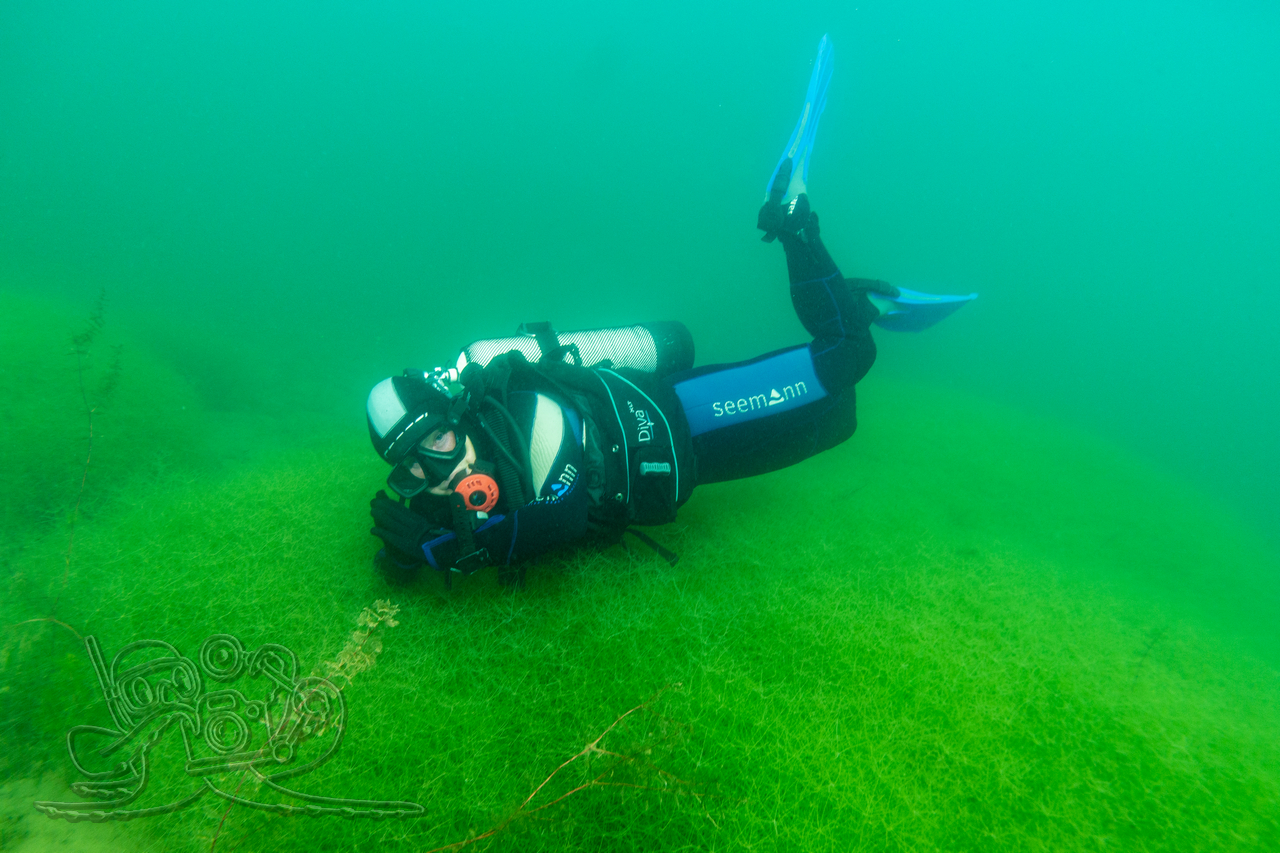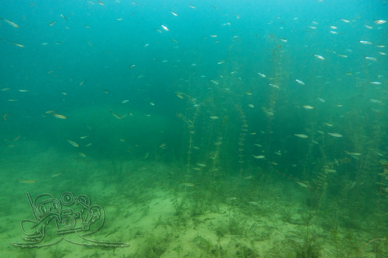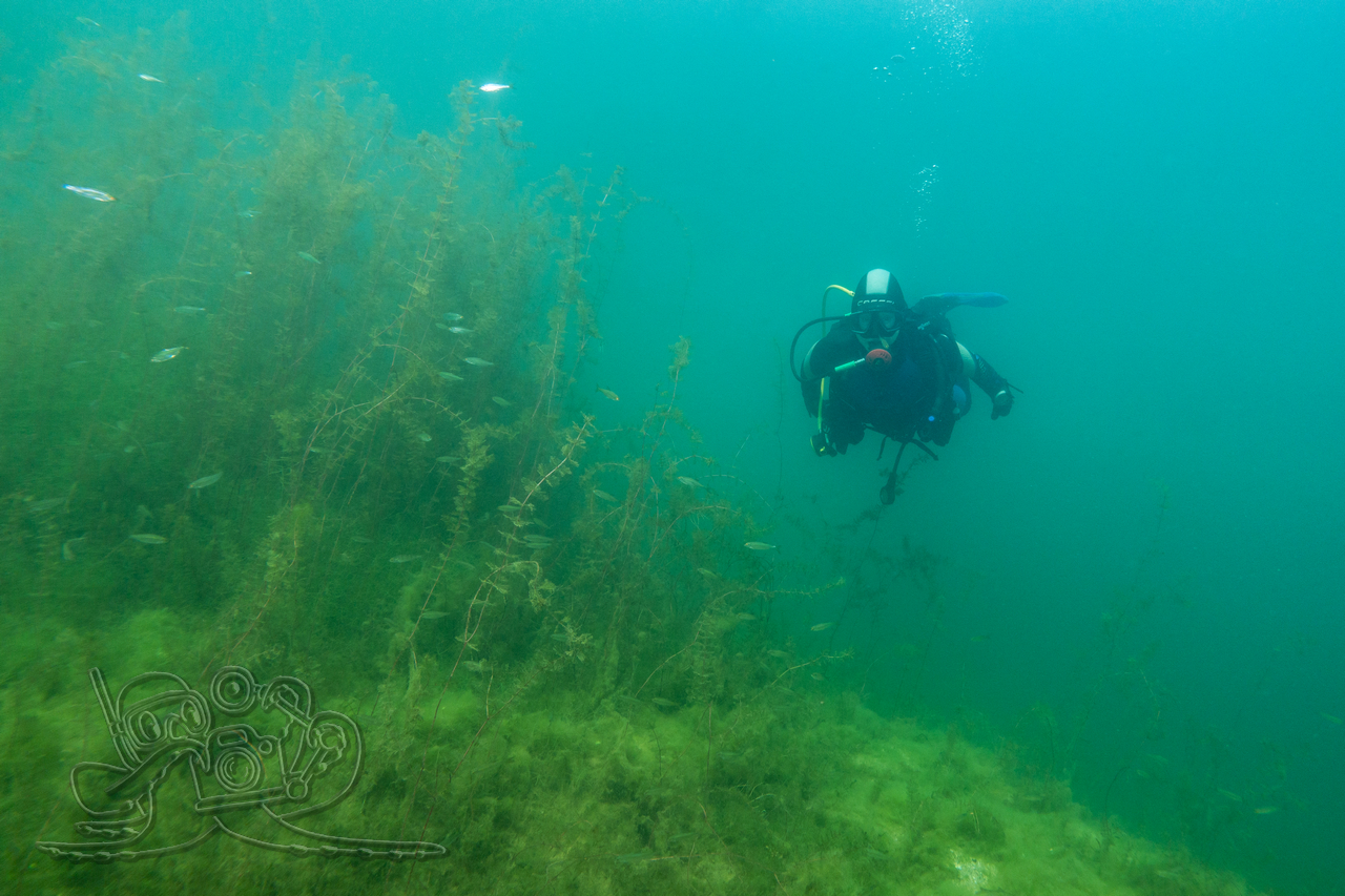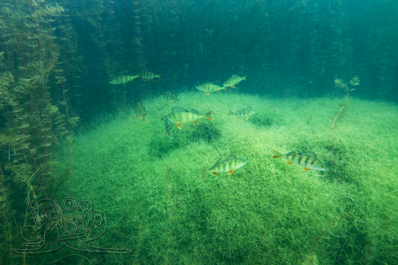 Beim ersten Tauchgang erkundeten wir die oberflächennahen Bereiche. Rund um flächige Sternarmleuchteralgen-Polster und am Tausendblattbestand fühlten wir uns wie in einem Süßwasseraquarium. Zahlreiche Kleinfischschwärme säumten unseren Weg. Gelegentlich schossen kleinere und größere Hechte aus dem Pflanzendickicht, um sich die Mägen zu füllen.
