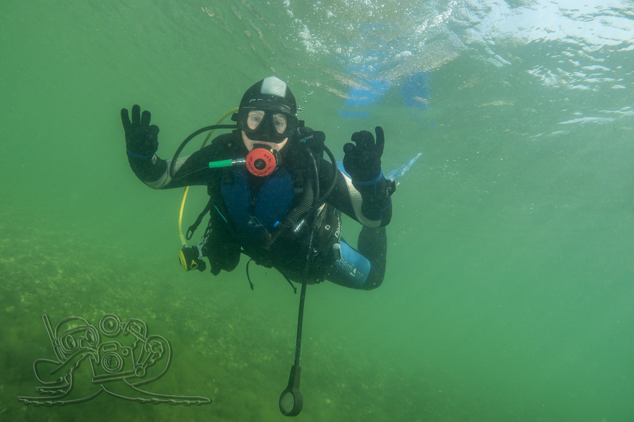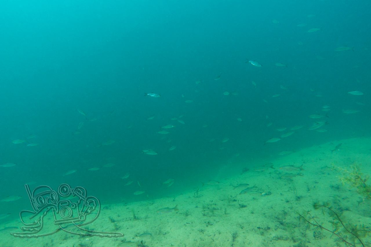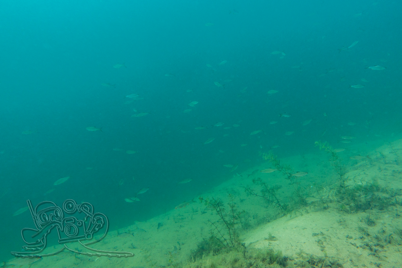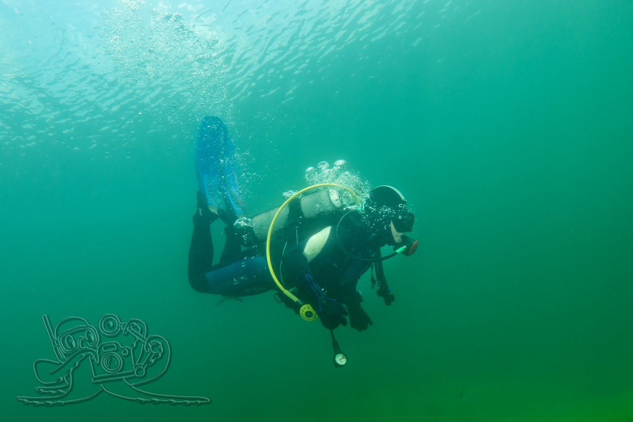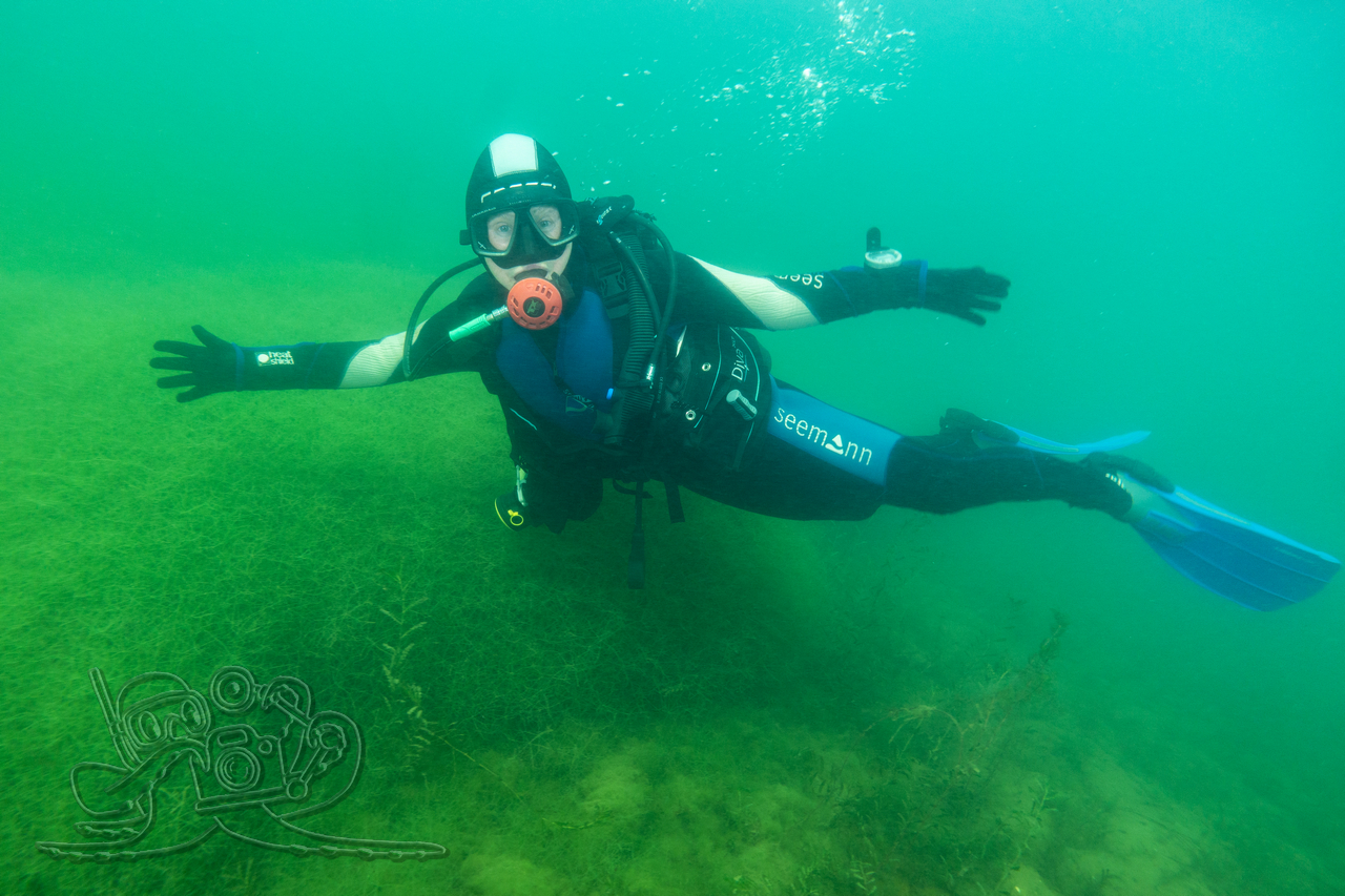 Beim ersten Tauchgang erkundeten wir die oberflächennahen Bereiche. Rund um flächige Sternarmleuchteralgen-Polster und am Tausendblattbestand fühlten wir uns wie in einem Süßwasseraquarium. Zahlreiche Kleinfischschwärme säumten unseren Weg. Gelegentlich schossen kleinere und größere Hechte aus dem Pflanzendickicht, um sich die Mägen zu füllen.