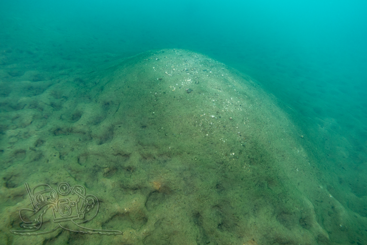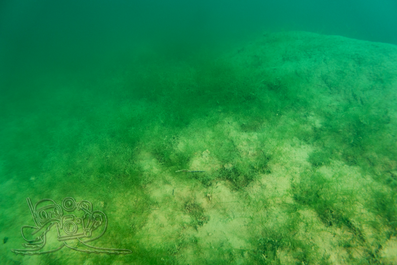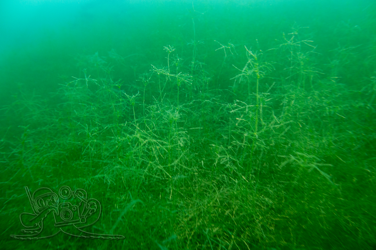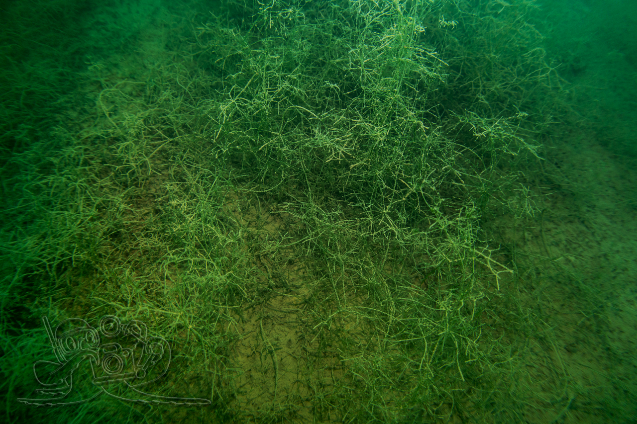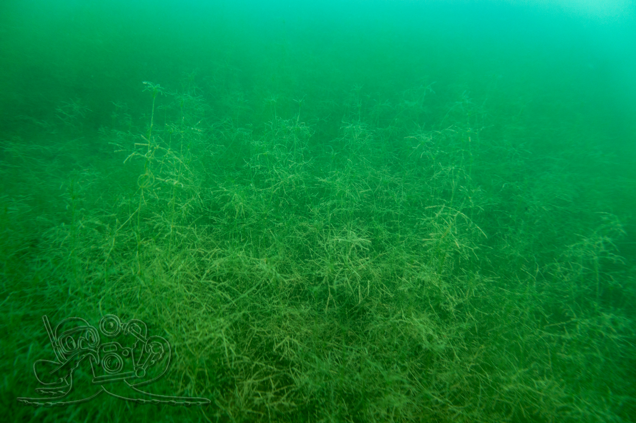 Der Grillensee ist heute ein beliebter Badesee und hat unter Wasser viele Gesichter. Bei Abtauchen an einer neuen Einstiegsstelle glitten wir zunächst über steile Kieshänge, denen „löchrige“ Sedimentböden folgten. Hier hatten die wühlenden Fische ganze Arbeit geleistet und nur mit Glück waren einzelne Makrophyten anzutreffen. Aber ab acht bis zehn Metern Wassertiefe, wo das Wasser merklich kühler wurde, empfingen uns weite Characeen-Wiesen. Diese reichten im flächigen Bestand bis durchschnittlich 13 Metern Wassertiefe. Aber auch bis stolze 20,1 Metern Wassertiefe (Untere Makrophytengrenze) konnten wir noch einzelne Characeen-Polster finden. Neben der Unterwasserflora begeisterten uns zugleich skurrile Kies-Formationen, die durchaus die Fantasie anregten.