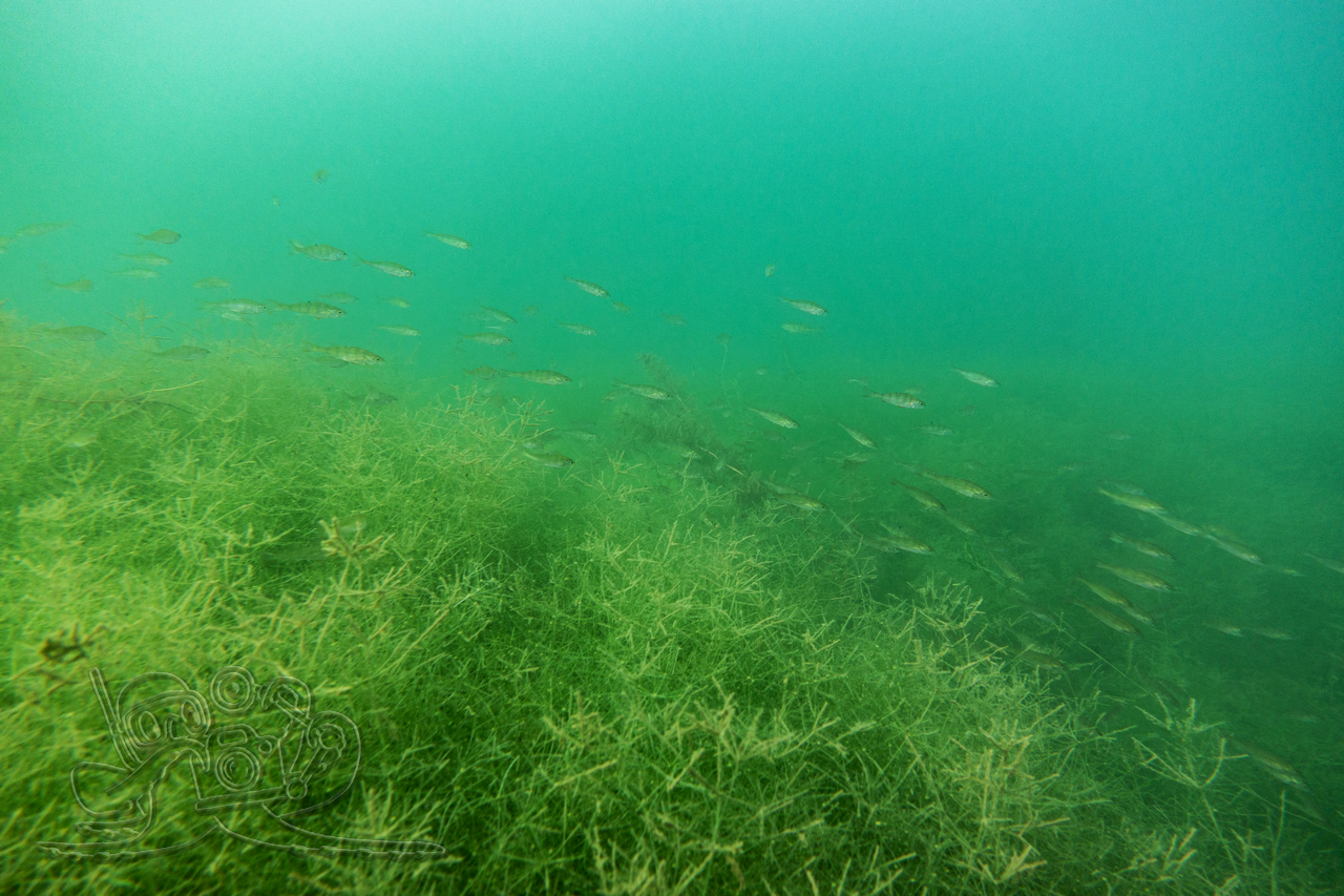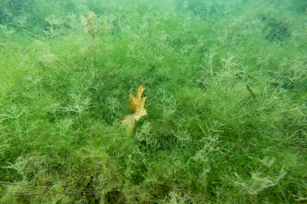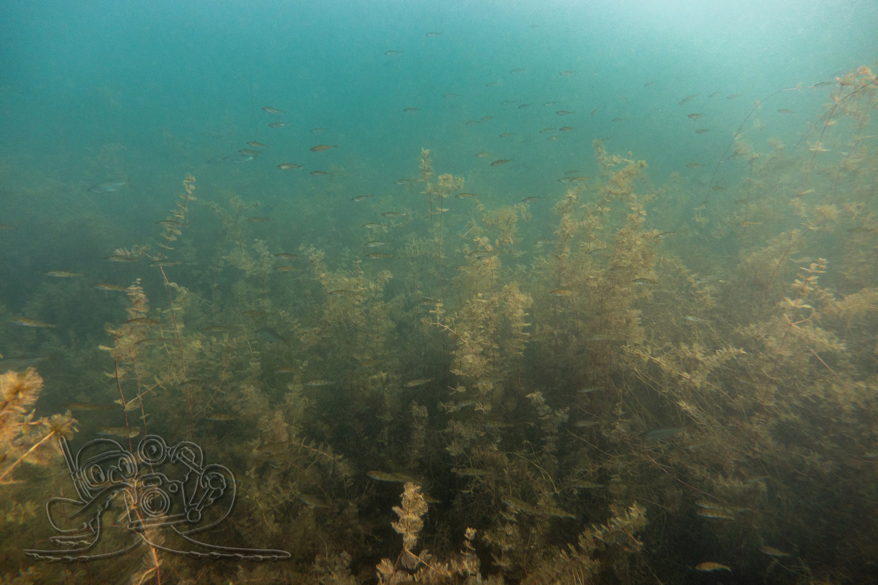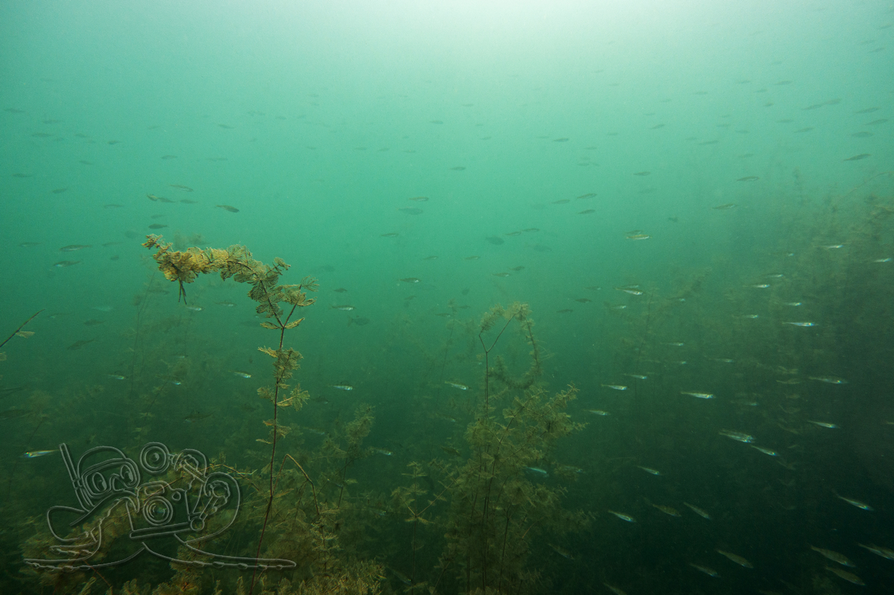 Bevor die Angler den Moritzsee für sich vereinnahmten, gönnten wir uns zum letzten Tag des Oktobers und sächsischen Feiertag zwei frühe Runden unter Wasser. Dort herrschte Herbststimmung: Die Vegetation war zurückgegangen, die größeren Fische hatten die Tiefe aufgesucht. So hatten die Fadenalgen in den lichtdurchfluteten Bereichen leichtes Spiel und ummantelten nicht nur Pflanzen. Wir ließen unsere Fantasie spielen und entdeckten so unter Wasser auch lang behaarte Köpfe.
