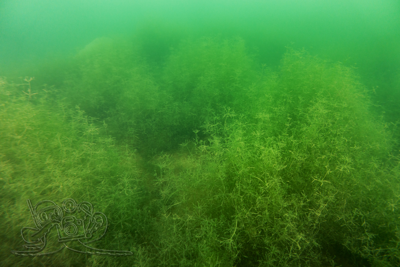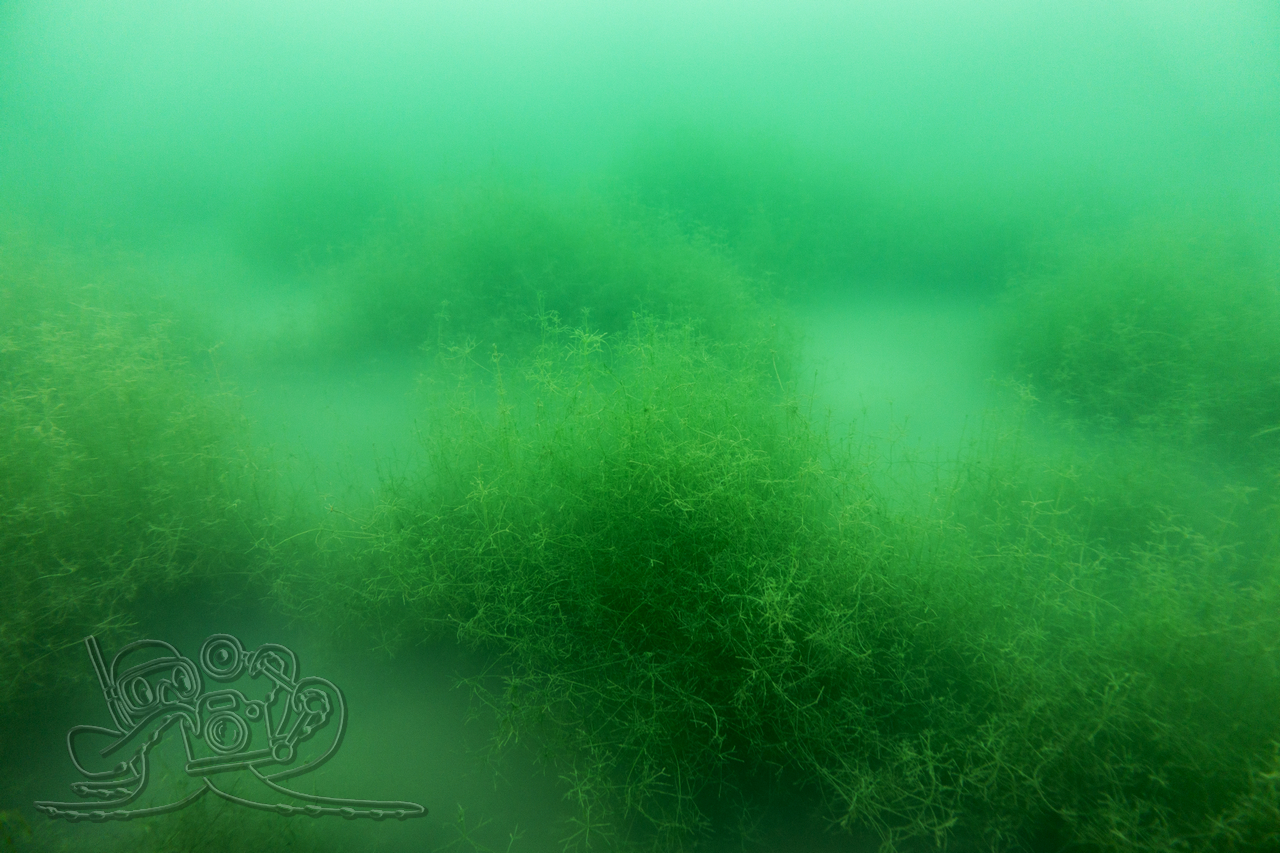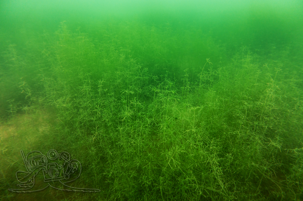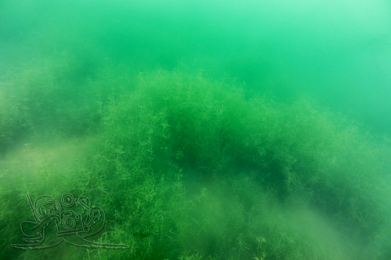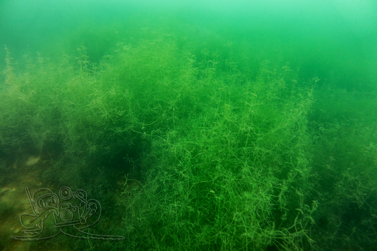 Heute sind wir in den Moritzsee und zugleich in den November eingetaucht. Wir starteten mit einem Sicht-Check. Dem Transekt folgend, mussten wir es mangels Sicht alsbald tasten. Ab 16 Meter Tiefe war Schluss mit dem Ausblick. Dafür sahen wir bei 16,1 Metern im Schein der Lampe noch Characeen und notierten eine für den See stolze Untere Makrophytengrenze. Uns zog es rasch wieder aufwärts. Bald empfingen uns grüne Wiesen mit Armleuchteralgen, die aus neblig-weißen Wolken ragten. Dazwischen huschten Schwärme kleiner Barsche und einzelne Rotaugen umher. Etwas höher besserte sich die Sicht leicht. Größere Barsche und halbstarke Hechte empfingen uns im Pflanzenbestand. Über die die weitreichenden Polster der Sternarmleuchteralgen kehrten wir schließlich ans Ufer zurück.