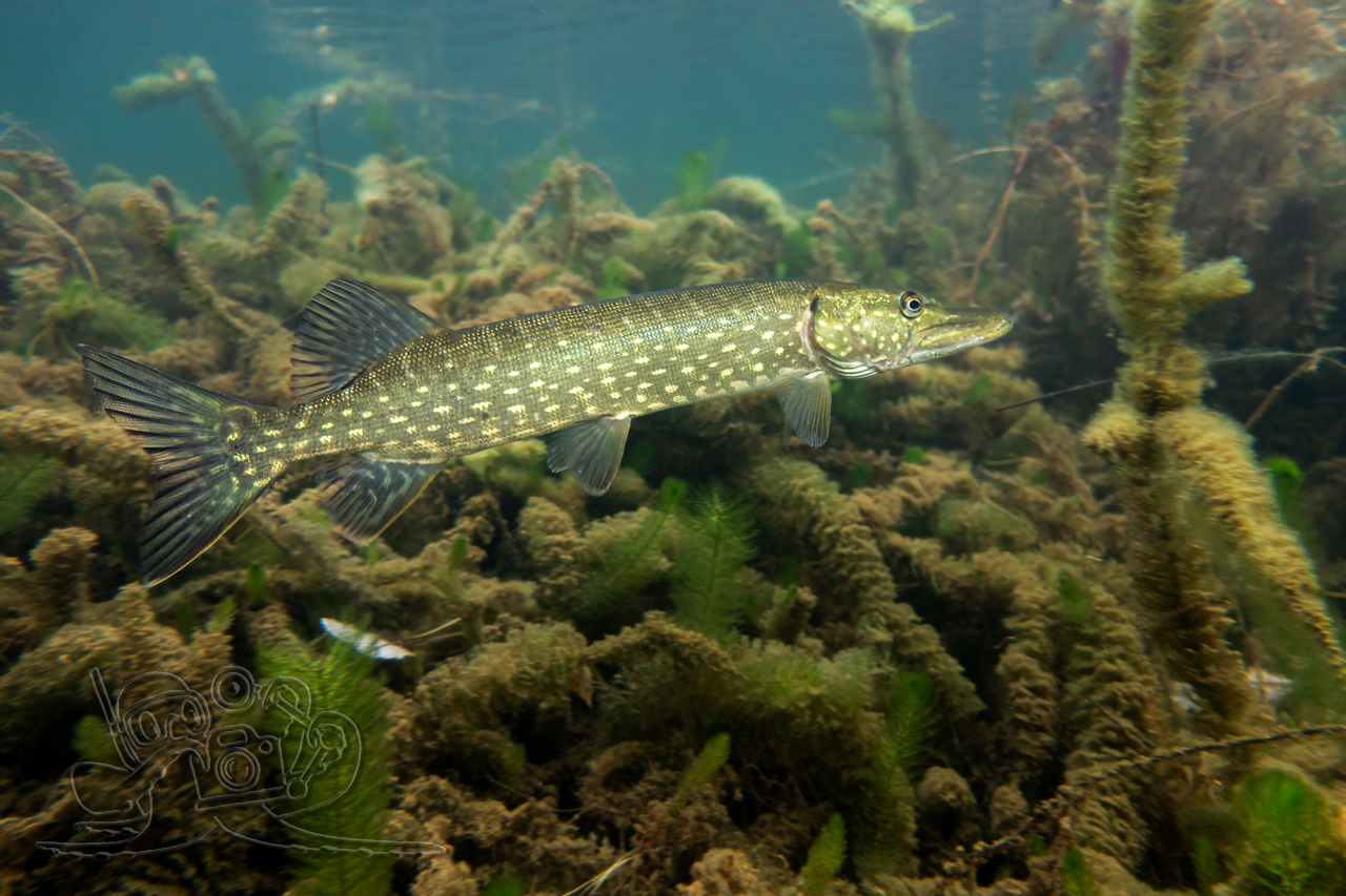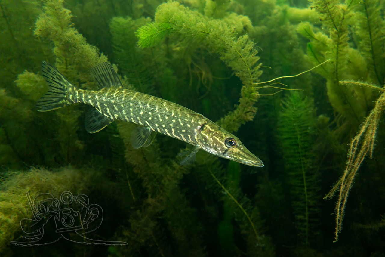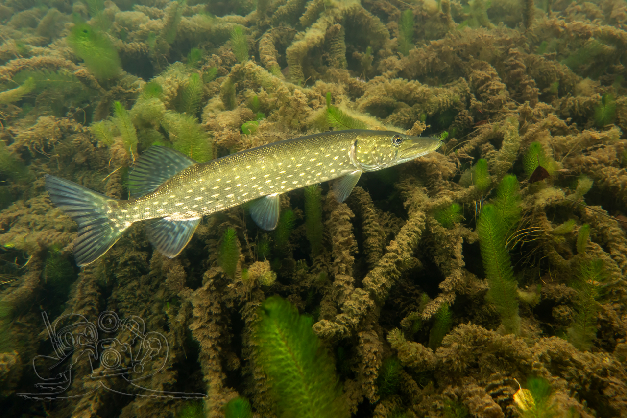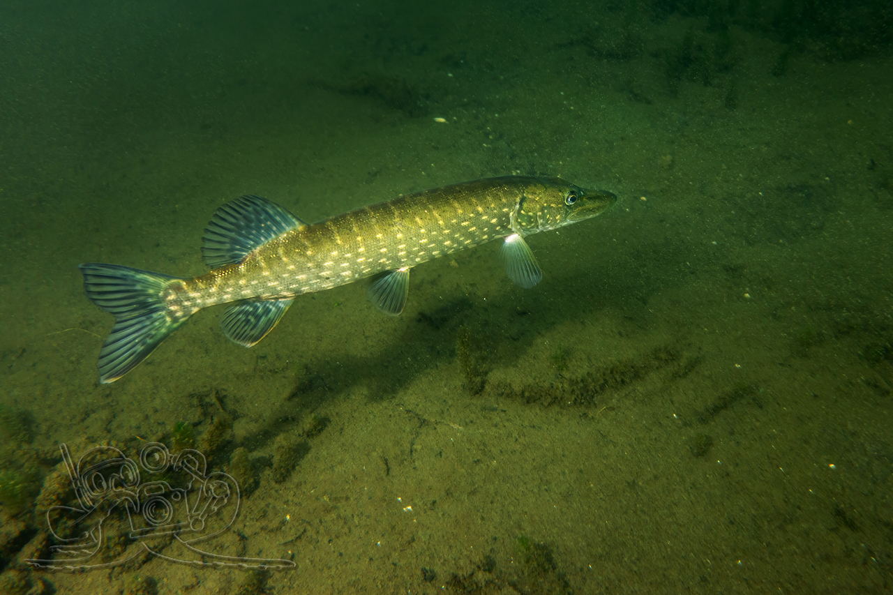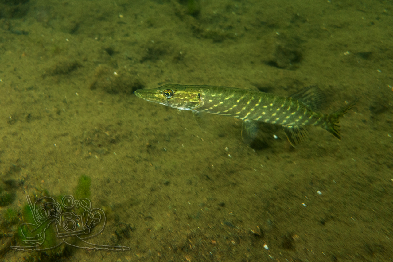 Dennoch hatte sich die Sonne schließlich hinter Wolken versteckt. Draußen war es dennoch hell, aber unter Wasser änderte sich das alsbald. Der Haselberg-Steinbruch hatte sich nahezu durchgängig in sein graues Nebelkleid geworfen, welches das rare Licht erfolgreich abwehrte. So wurde aus unserem Tauchgang rasch eine Dämmerungs-, alsbald auch eine Nachttauchrunde, wenngleich die Uhr etwas anderes sagte. Scheinbar tummelten sich aber umso mehr Fische im neblig-grauen Nass: Zahlreiche Karpfen, Barsche und Kleinfische begegneten uns in allen Tiefen. Vor allem Hechte zeigten sich in jeder Größe: vom fingerstarken Frischling bis zum großen Platzhirsch konnten wir sie alle entdecken. Bei unserem Abstecher in die Tiefe des Kessels entdeckten wir leider erneut einen kleinen Marmorkrebs auf dem lockere Sediment. Als invasive Art und zugleich gefährdend für unsere regionalen Edelkrebsbestände werden wir den Fund wieder an die zuständigen Behörden melden.