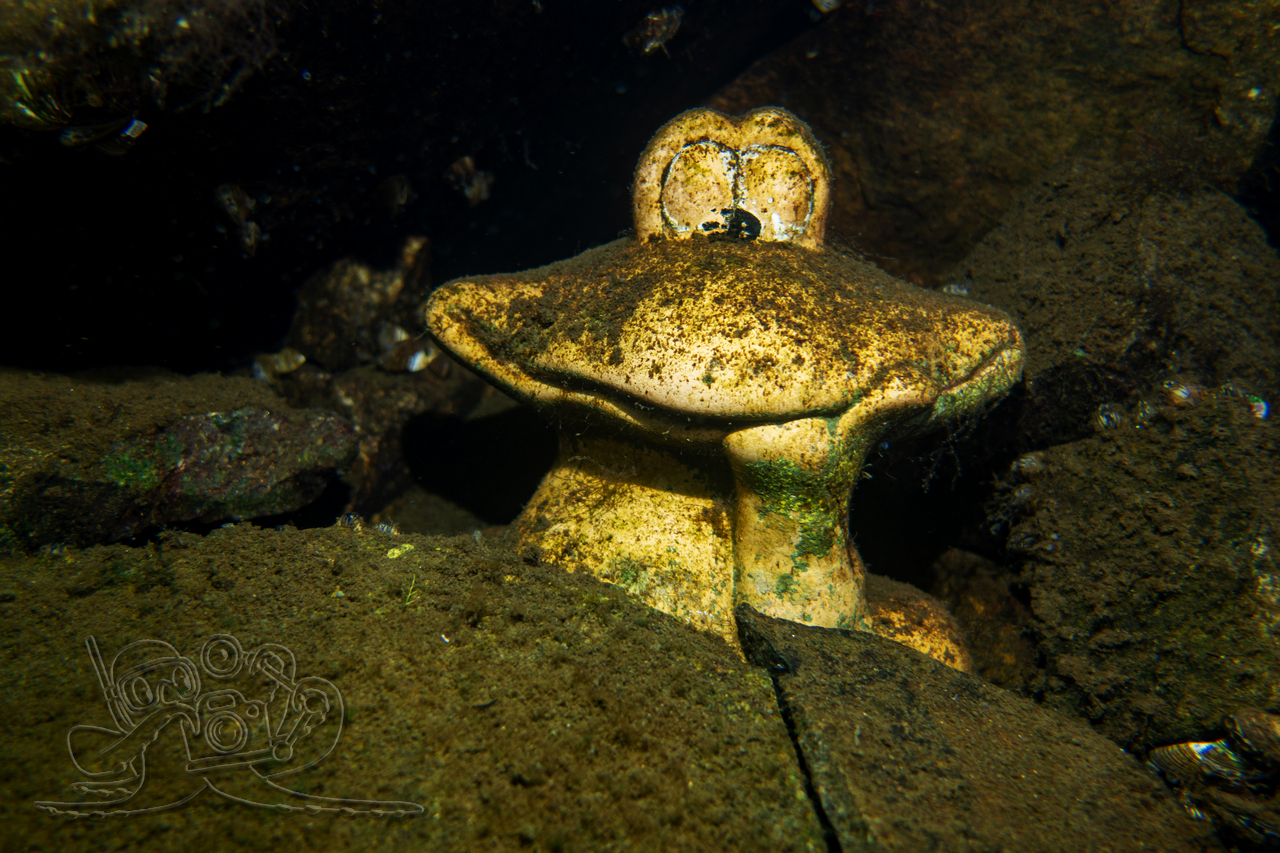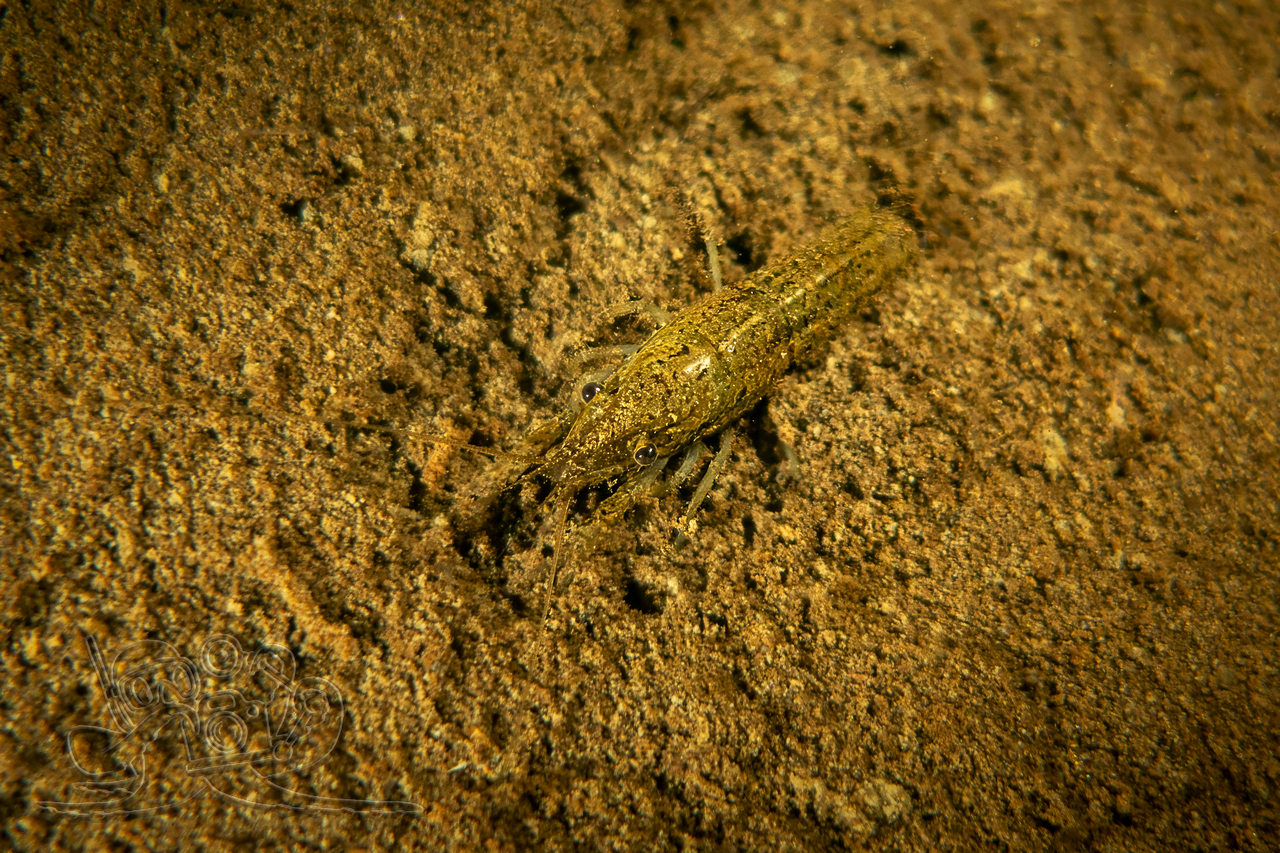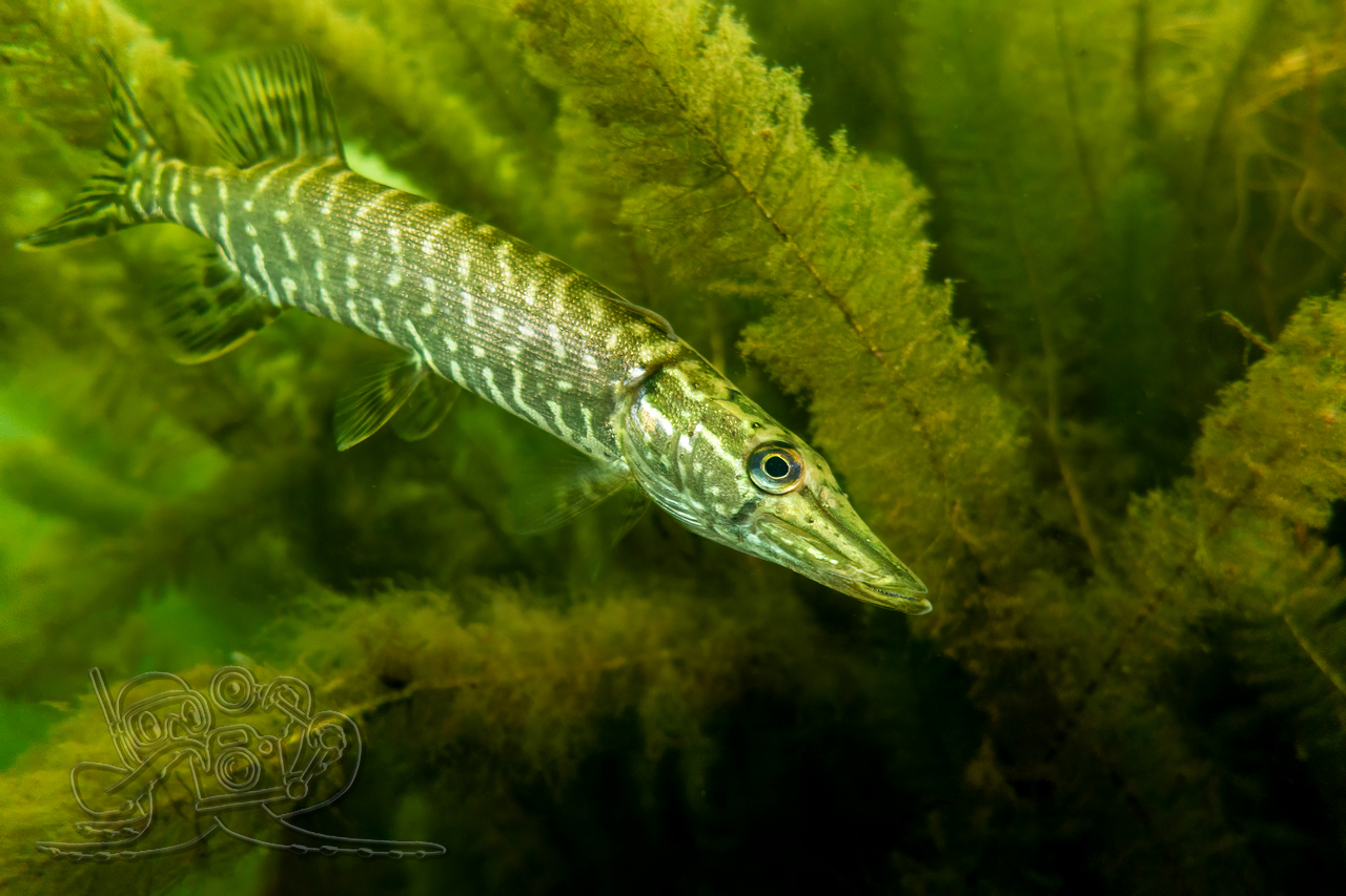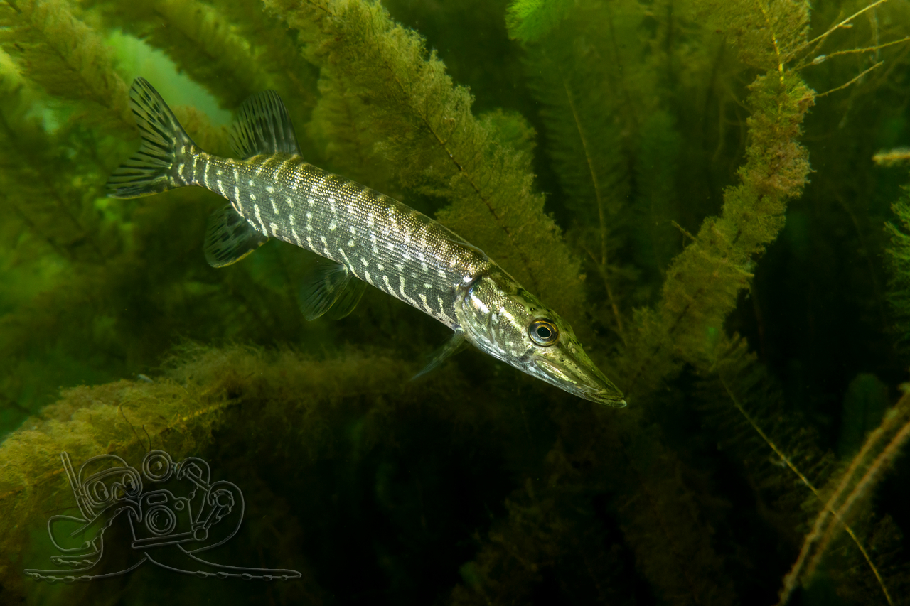 Dennoch hatte sich die Sonne schließlich hinter Wolken versteckt. Draußen war es dennoch hell, aber unter Wasser änderte sich das alsbald. Der Haselberg-Steinbruch hatte sich nahezu durchgängig in sein graues Nebelkleid geworfen, welches das rare Licht erfolgreich abwehrte. So wurde aus unserem Tauchgang rasch eine Dämmerungs-, alsbald auch eine Nachttauchrunde, wenngleich die Uhr etwas anderes sagte. Scheinbar tummelten sich aber umso mehr Fische im neblig-grauen Nass: Zahlreiche Karpfen, Barsche und Kleinfische begegneten uns in allen Tiefen. Vor allem Hechte zeigten sich in jeder Größe: vom fingerstarken Frischling bis zum großen Platzhirsch konnten wir sie alle entdecken. Bei unserem Abstecher in die Tiefe des Kessels entdeckten wir leider erneut einen kleinen Marmorkrebs auf dem lockere Sediment. Als invasive Art und zugleich gefährdend für unsere regionalen Edelkrebsbestände werden wir den Fund wieder an die zuständigen Behörden melden.