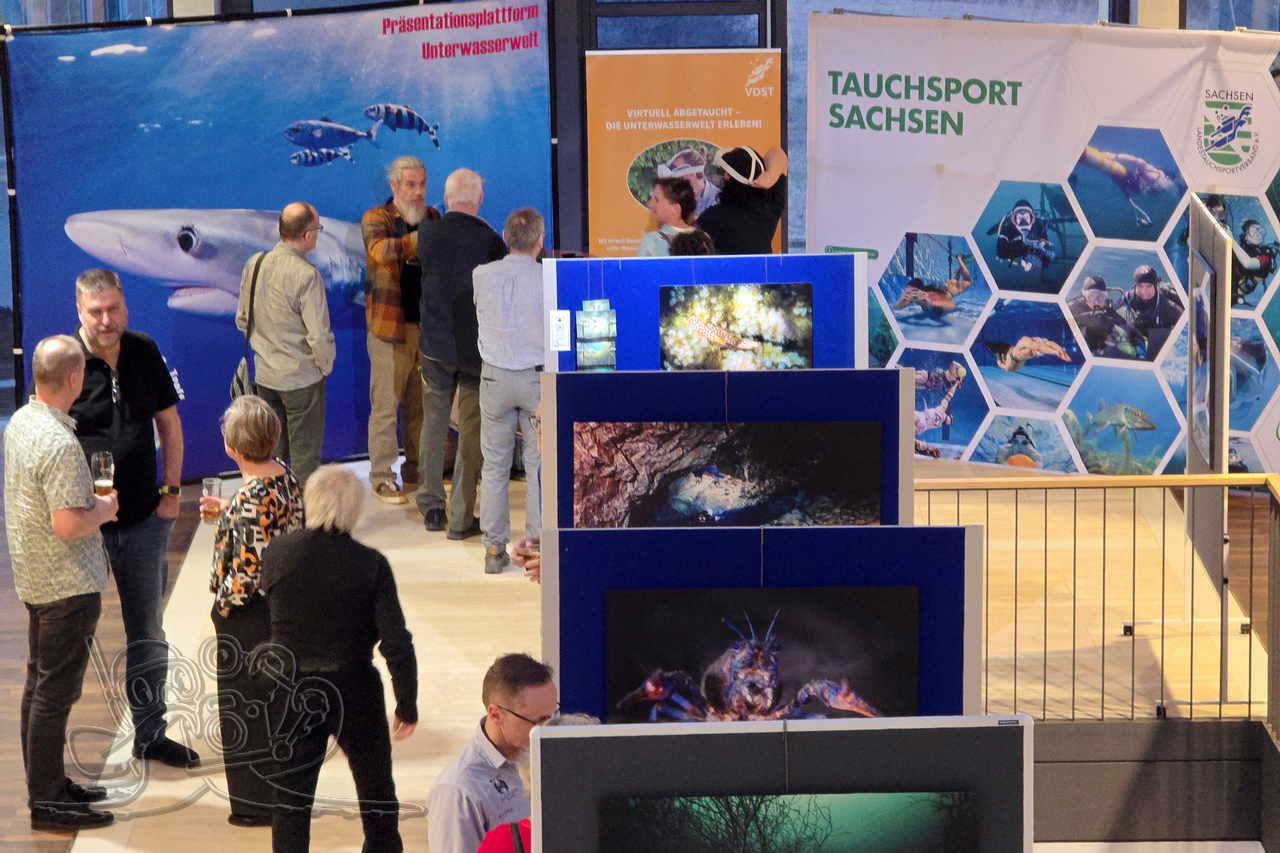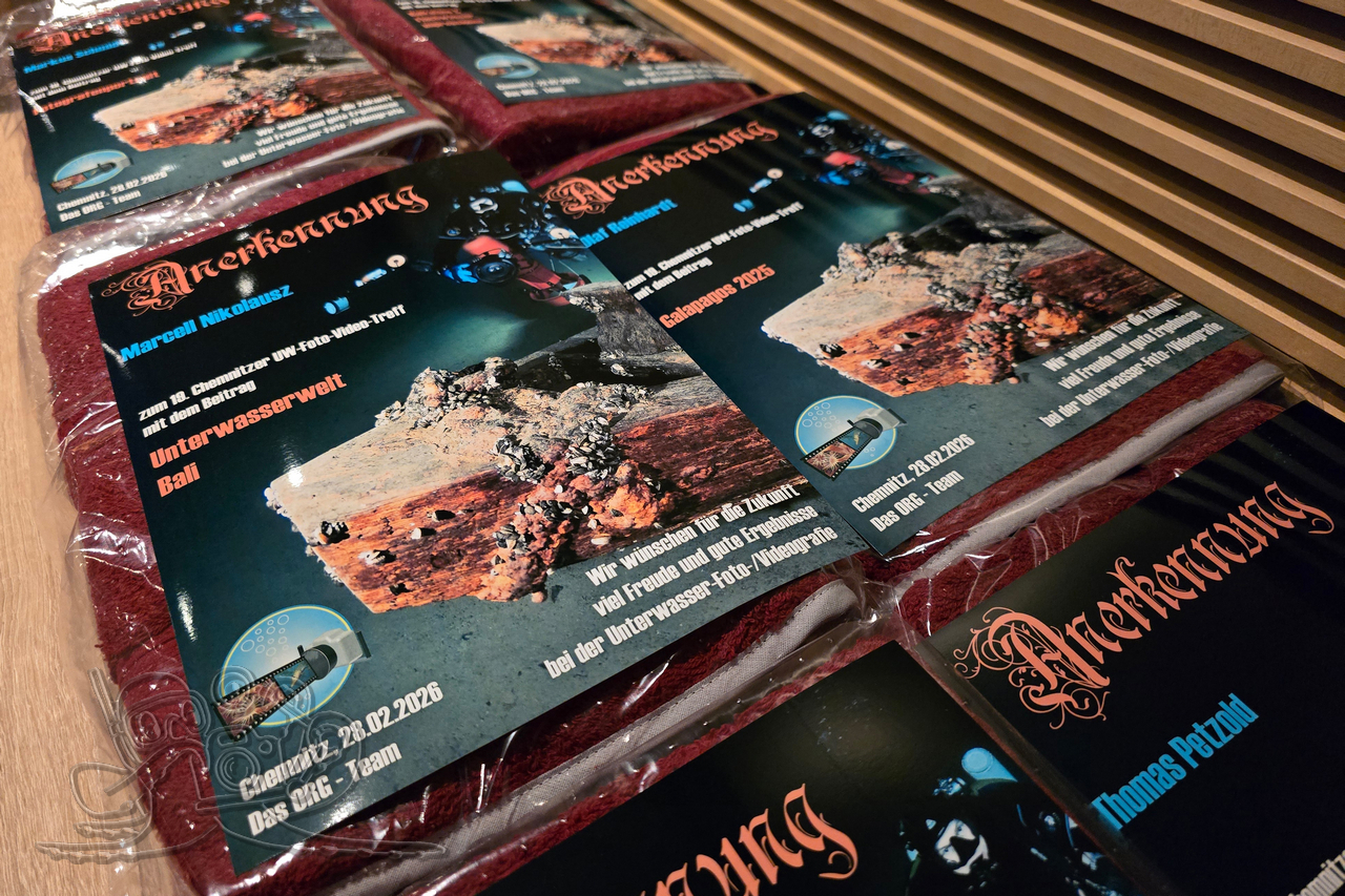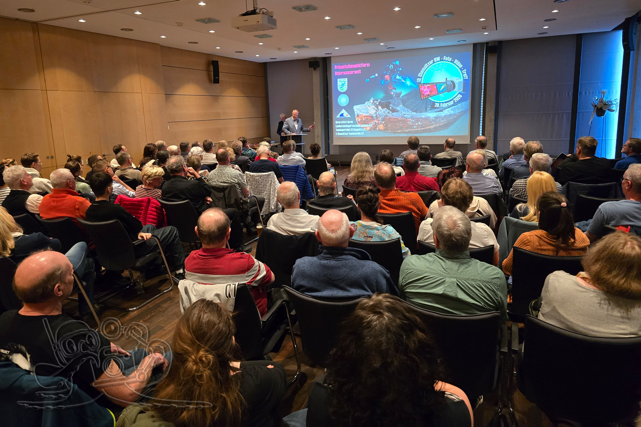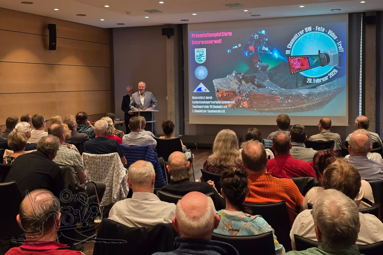 Damit reihten sie sich in die rekordverdächtige Zahl von knapp einhundert Gästen ein, die zum inzwischen 19. Chemnitzer UW-Foto-Video-Treff nach Lichtenwalde gekommen waren. Das Orga-Team mit Wolfgang Zock, Jörg Böttcher und Falko Schleif hatte auch in diesem Jahr wieder hochkarätige Referenten gewinnen können, die mit Fotos und Videos auf eine Unterwasser-Weltreise einluden. Die acht Beiträge führten uns dabei nach Galapagos, den Baikalsee, Malaysia, Grönland, Bali, die Philippinen, Österreich und auch heimische Gewässer. Der ohnehin kurzweilige Abend gewann in den Pausen zusätzlich durch viele anregende Gespräche unter den anwesenden Unterwasserfoto- und -videografen sowie auch durch Ausflüge per VR-Brille in die bunte Unterwasserwelt. Herzlichen Dank allen Beteiligten – wir freuen uns bereits auf das Jubiläumstreffen im nächsten Jahr!