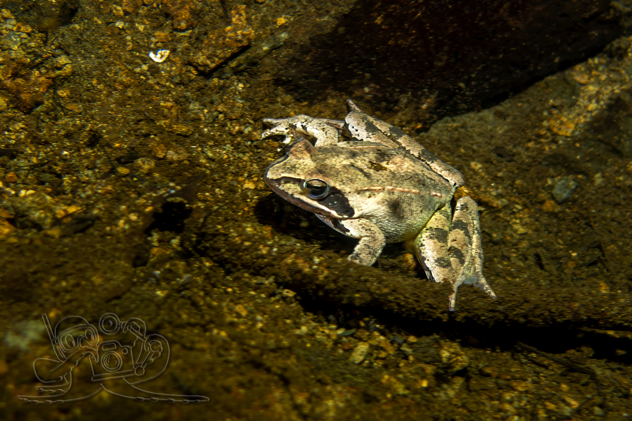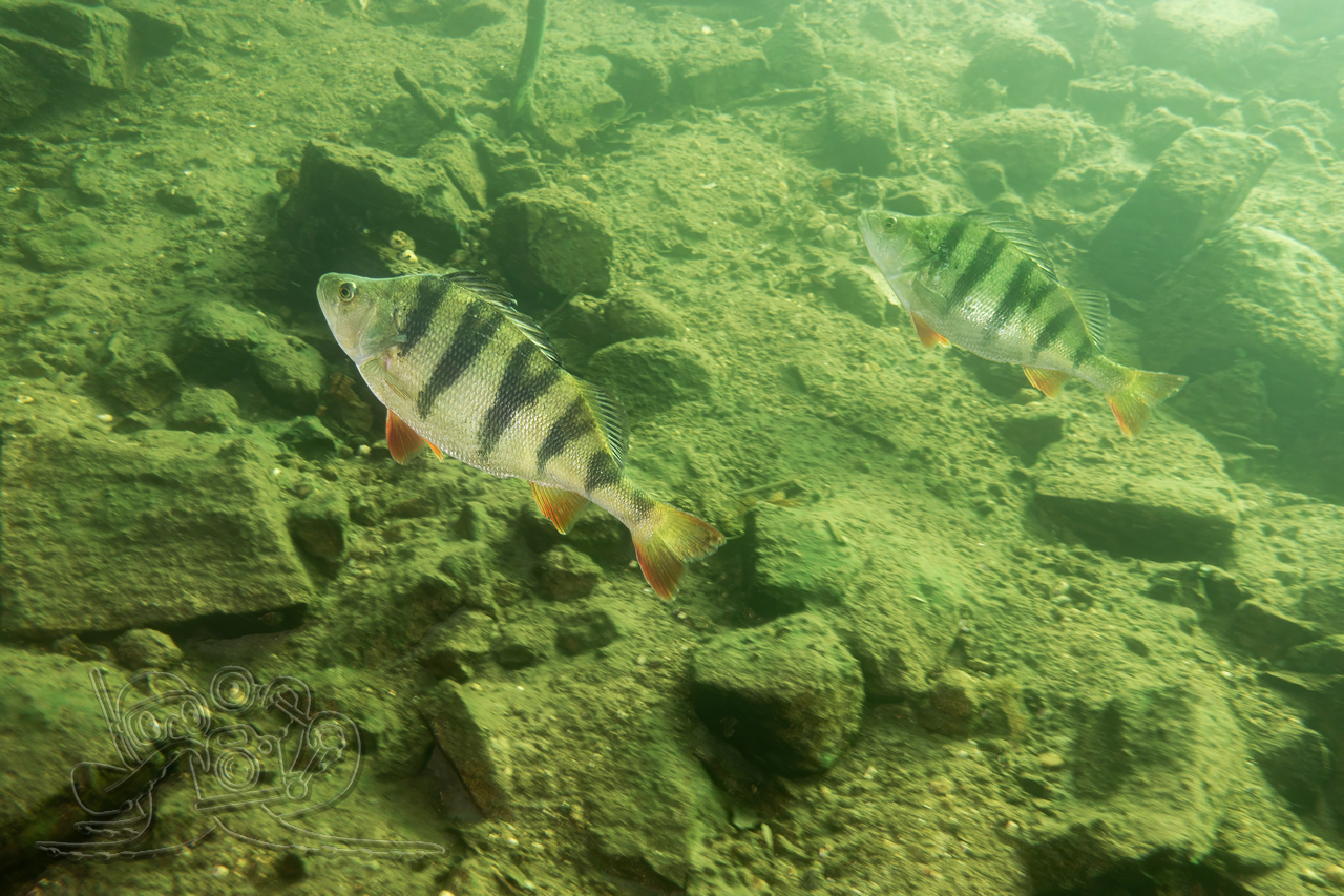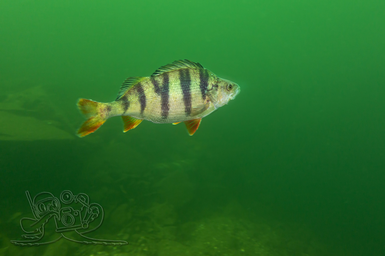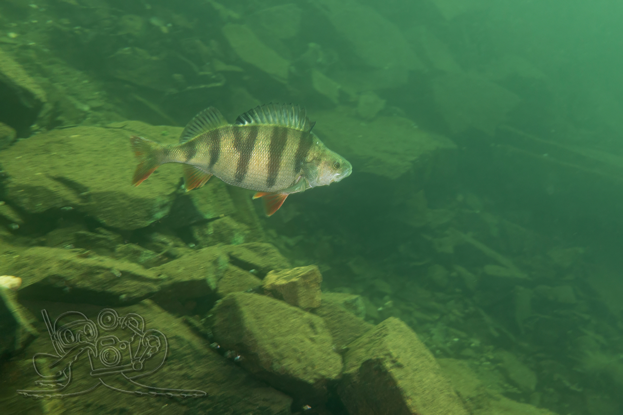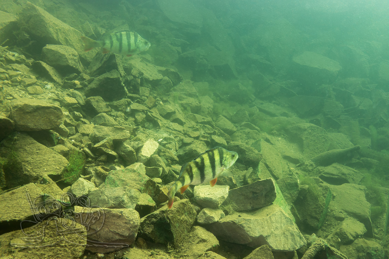 Die Sonne hatte die Luft erst auf 6 °C erwärmen können. Das Wasser bot im oberen Bereich die gleiche Temperatur und vermied damit Kontraste. Wir drehten eine zumeist oberflächennahe Runde. Die Sicht war für die Jahreszeit recht gut, aber außer ein paar Karpfen begegneten uns nur Rotaugenschwärme, ein einjähriger Hecht sowie zwei ältere Flussbarsch-Damen. Schwimmfüße unter Wasser zeigten uns an, dass inzwischen die Graugänse am Steinbruch eingetroffen waren. Wirklich überrascht hatte uns aber ein besonderer Tieftaucher: Ein Grasfrosch schwamm putzmunter in bis zu 16 Metern Wassertiefe vor uns her. Hauptsache, er findet später auch den Ausgang aus dem Steinbruch.