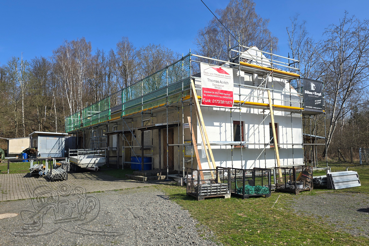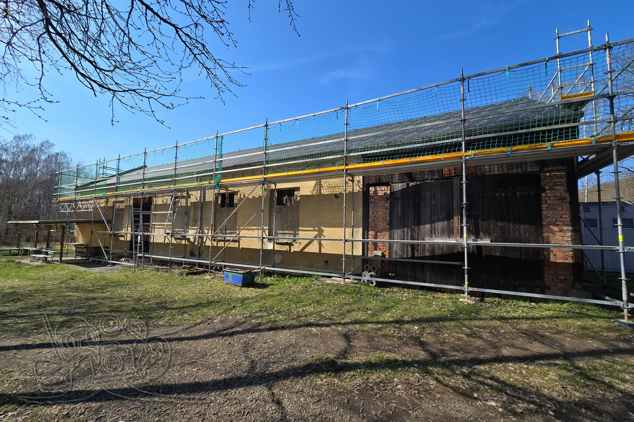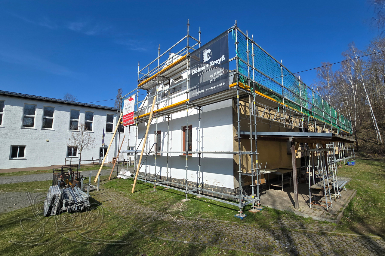 Das TANA, Stützpunkt des Landestauchsportverbands Sachsen e. V., zeigte die eingerüstete Taucherlast: Hier wird gegenwärtig die dringend notwendige Dachsanierung durchgeführt.