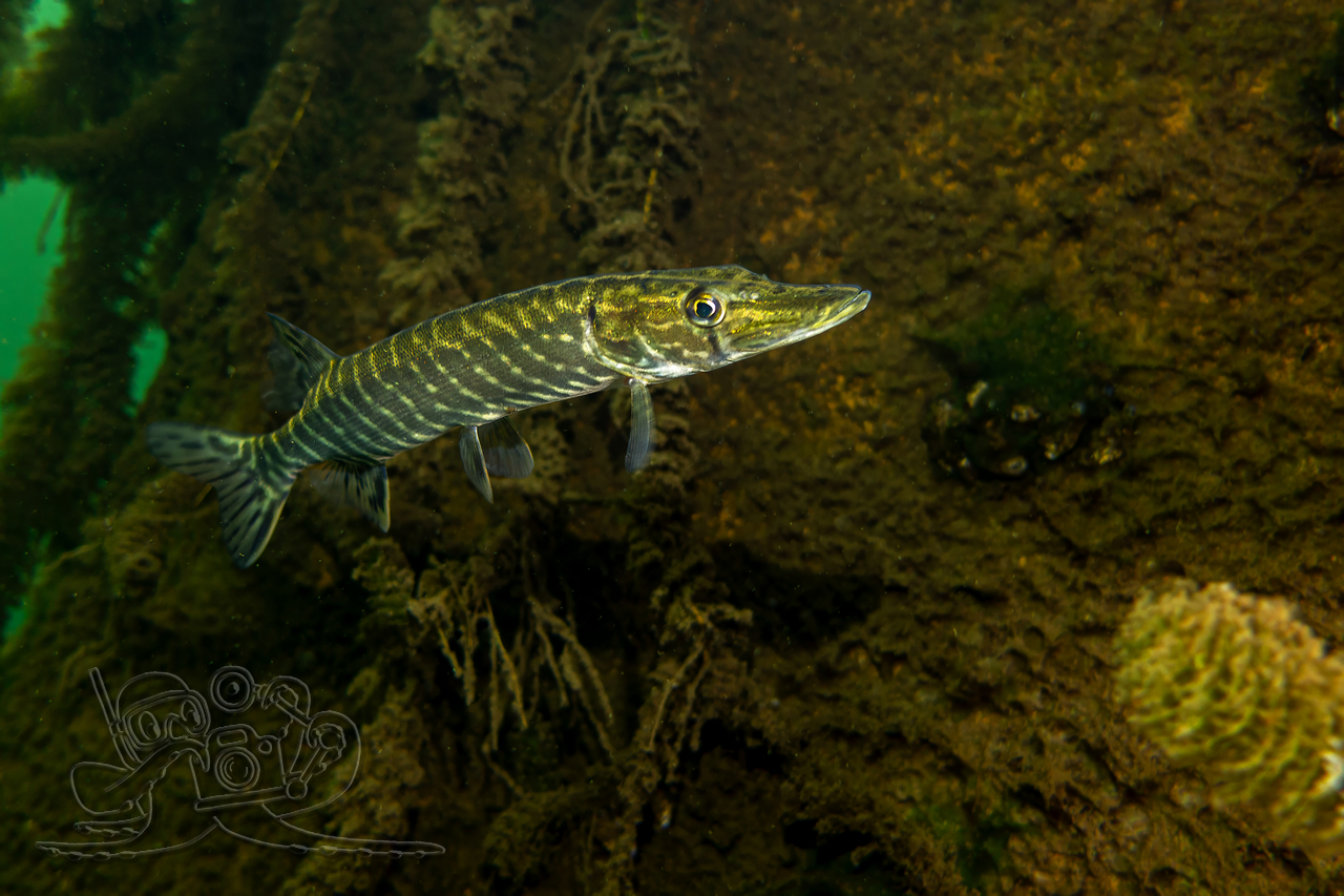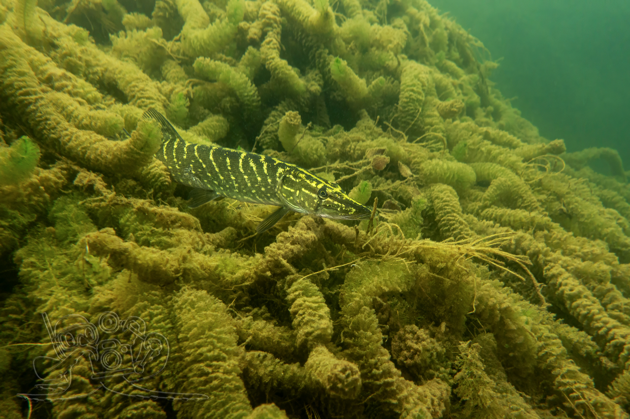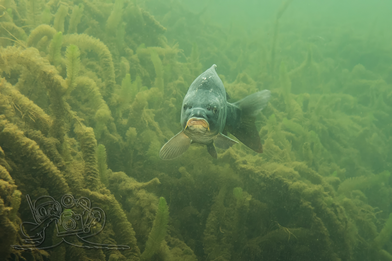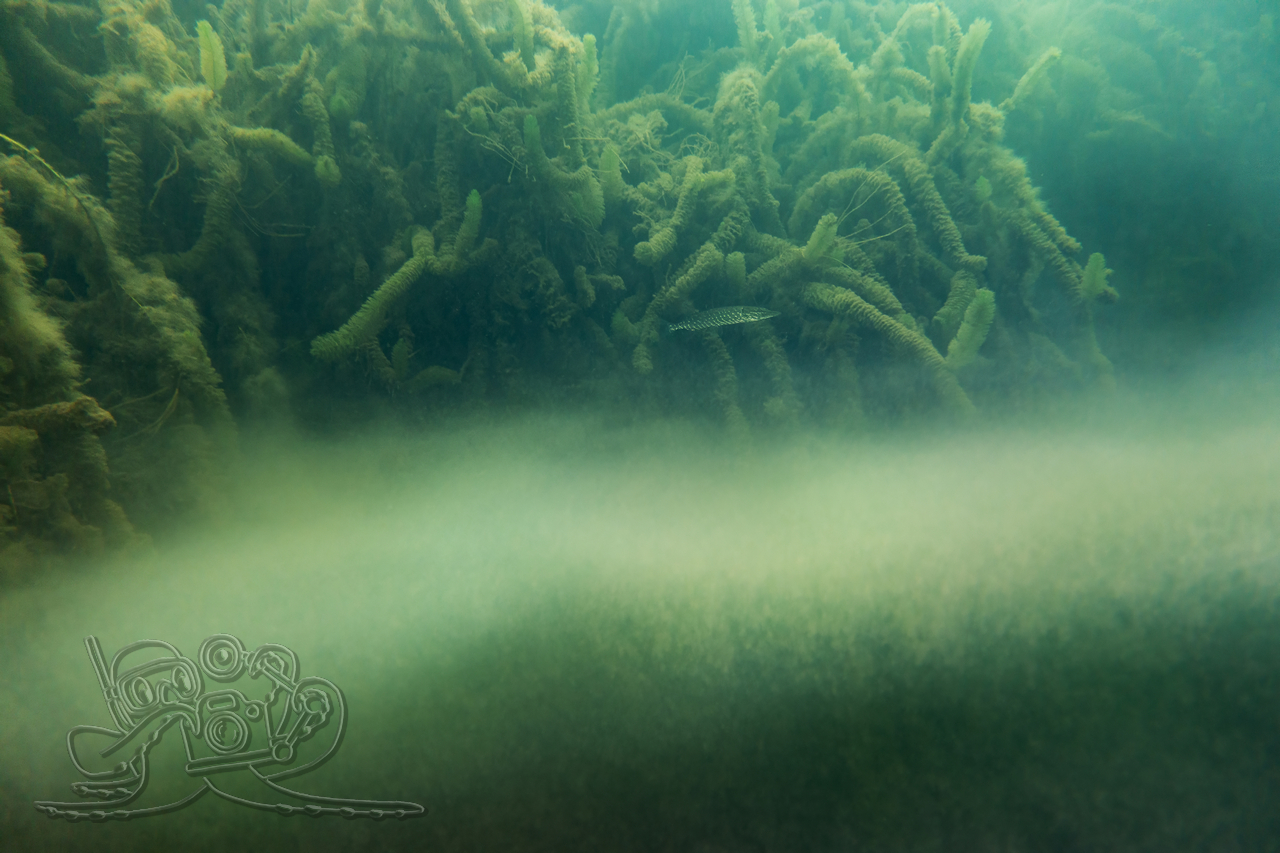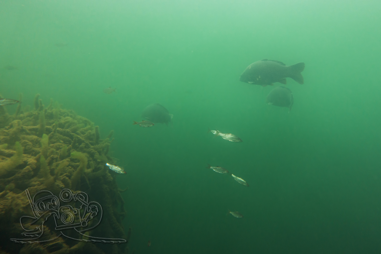 Bei dem nicht gerade einladenden Wetter blieben wir auch die einzigen Taucher in der Frühe. Die Temperatur nahe der Oberfläche hatte trotz zurückliegender Nachtfröste die 9 °C-Marke erreicht. Die Sicht allerdings hatte sich weiter eingetrübt, die wühlenden Karpfen leisteten fleißig ihren zusätzlichen Beitrag. Neben Kleinfischschwärmen von Rotaugen und Flussbarschen waren die Karpfen auch die ersten größeren Fische, die wir sahen. Heute konnte wir nur wenige und zumeist kleinere Hechte entdecken. Dafür überraschte uns ein erstes Flussbarsch-Laichband im Tausendblatt. Die Saison scheint trotz kühler Wassertemperaturen zu starten. Ein Abstecher zu Wartburg und Loren rundete die reichliche Stunde „Frühsport“ für uns ab.